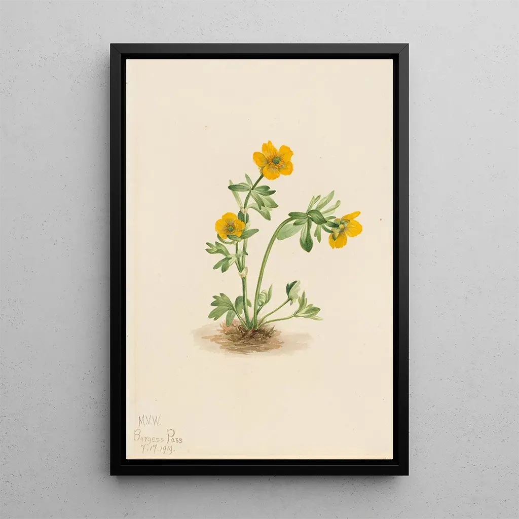 Taidegrafiikka Renoncule des avalanches, Ranunculus suksdorfii, johdattaa meidät herkkään ja eloisan kukkamaailman maailmaan. Tämän teoksen kirkkaat värit, jotka vaihtelevat kirkkaasta keltaisesta pehmeään vihreään, muistuttavat alppipellon raikkaudesta. Mary Vaux Walcottin tekniikka, joka yhdistää kasvitieteen tarkkuuden ja taiteellisen herkkyyden, luo rauhallisen ja mietiskelevän ilmapiirin. Jokainen terälehti näyttää vangitsevan valon, kutsuen katsojan ihmettelemään luonnon ohikiitävää kauneutta. Tämä kangas on paljon enemmän kuin pelkkä kuva; se on kasvi- ja luonnon elämän juhla.