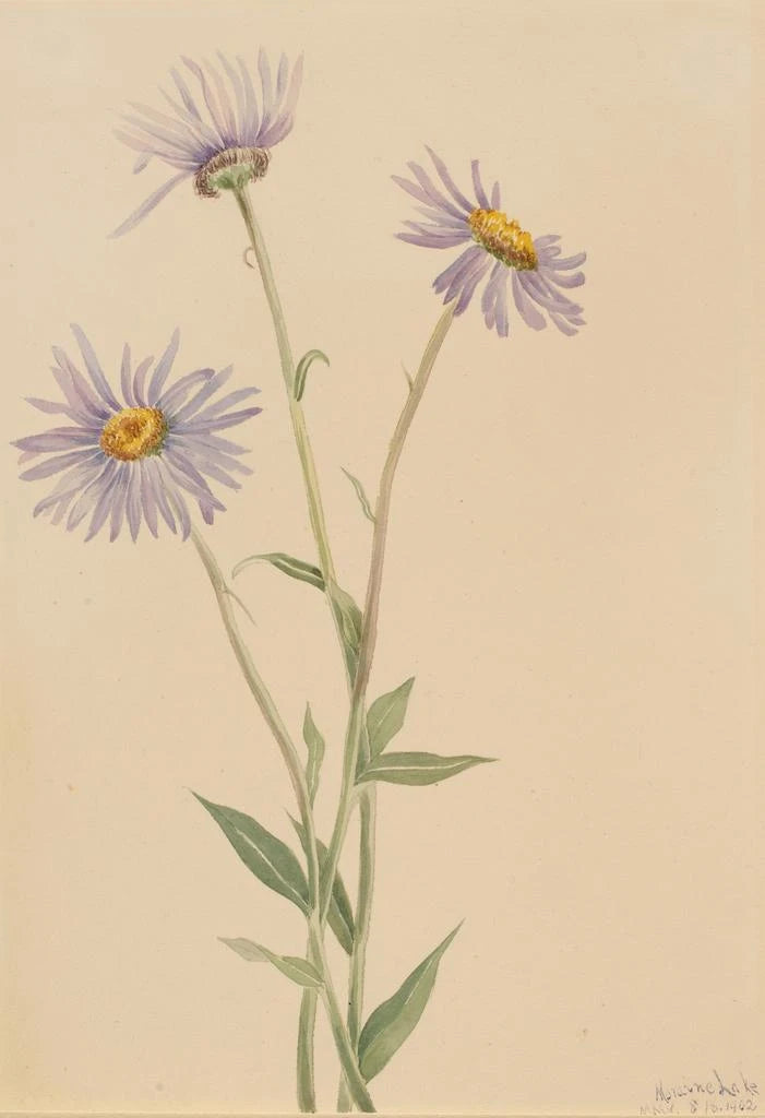 "Vergerette salsuginosus", Mary Vaux Walcottin teos, kuljettaa meidät maailmaan, jossa luonnonkasvit kukoistavat arvokkaasti. Hienovaraisesti sävytetyt vihreän ja keltaisen sävyt herättävät kesäisten niittyjen lämpöä. Vesiväritekniikka mahdollistaa Walcottin vangitsevan tämän kasvin keveyden ja hienostuneisuuden, samalla korostaen sen kasvitieteellisiä yksityiskohtia. Tämä taidegrafiikka on todellinen biodiversiteetin juhla, muistuttaen luonnonympäristömme säilyttämisen tärkeydestä, samalla tarjoten rauhoittavan ja inspiroivan näkymän.