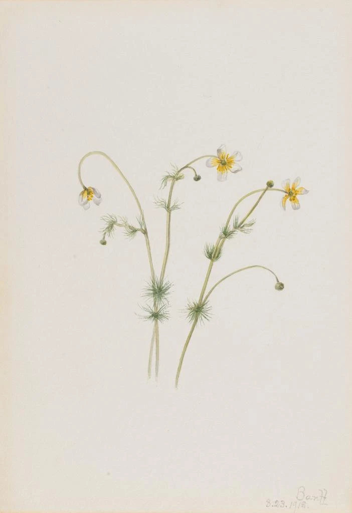 Mary Vaux Walcottin taidegrafiikka Renoncule aquatique vangitsee tämän vesikasvin hienostuneisuuden ja haurauden. Sen kirkkaan keltaiset terälehdet herättävät tunteen raikkaudesta ja keveydestä. Vesiväritekniikka mahdollistaa valon heijastusten tarkkaan kuvaamiseen vedessä, luoden rauhallisen ja mietiskelevän ilmapiirin. Jokainen yksityiskohta, hienovaraisista lehdistä veden aaltoihin, on huolellisesti esitetty, kutsuen katsojan sukeltamaan floraleihin täynnä rauhaa.