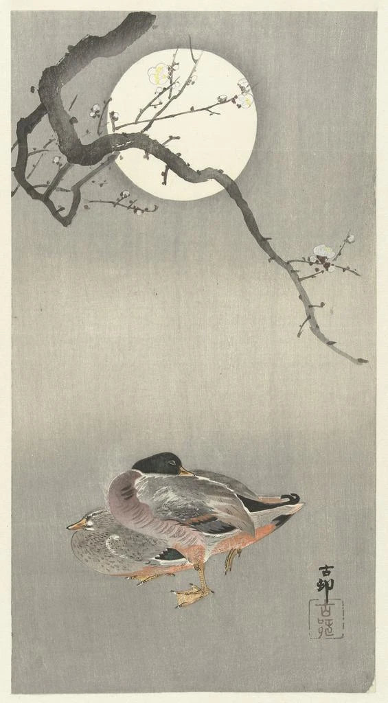 Ohara Koson, actif durant la période Taisho (1912-1926), est reconnu pour ses œuvres qui célèbrent la nature et la vie quotidienne. Influencé par les traditions de l'ukiyo-e, il a su allier techniques anciennes et sensibilité moderne, se distinguant par son utilisation subtile des couleurs et des motifs. Koson a souvent représenté des oiseaux et des fleurs, capturant leur essence avec une précision poétique. Son travail, bien que moins connu que celui de ses contemporains, joue un rôle essentiel dans la préservation de l'art japonais. La taidegrafiikka de "Canards à la pleine lune" témoigne de son talent et de son engagement envers la beauté naturelle.