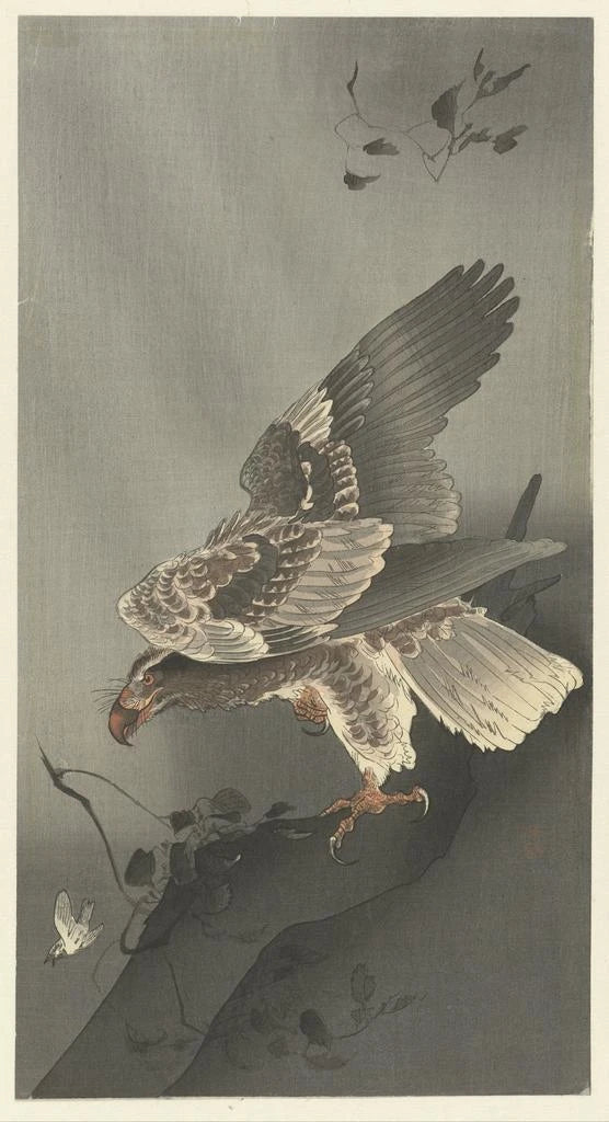 L'œuvre "Aigle à l'affût de proie" d'Ohara Koson vangitsee hetken jähmettyneisyyden ajan pysäyttämässä hetkessä. Taiteilija käyttää maanläheisiä värejä ja sinisen sävyjä luodakseen maiseman rauhallisuuden vaikutelman, samalla korostaen kotkan voimaa, jonka terävä katse vaikuttaa tutkivan horisonttia saalista etsien. Ukiyo-e-tekniikka, jossa painetaan puulaatojen avulla paperille, antaa tälle taideteokselle ainutlaatuisen tekstuurin ja syvyyden. Tämän teoksen tunnelma on sekä rauhallinen että jännitteen täyttämä, kutsuen katsojan ihailemaan luonnon villiä kauneutta.