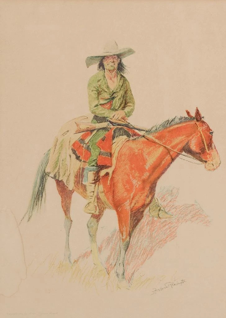 Frederic Remington, taiteilija ja kuvittaja, syntynyt 1861, tunnetaan yhtenä lännen taiteen suurimmista edustajista. Hänen uransa, joka oli täynnä intohimoa cowboyn ja intiaanien elämää kohtaan, sai vaikutteita matkoistaan läpi amerikkalaisen lännen. Remington osasi vangita näiden maisemien villin kauneuden ja samalla kunnioittaa niiden asukkaita. Hänen ainutlaatuinen tyylinsä, joka yhdistää realismia ja romantiikkaa, dokumentoi amerikkalaisen historian käännekohtaa, tehden hänestä etuoikeutetun todistajan sosiaalisten ja kulttuuristen muutosten aikakaudella.