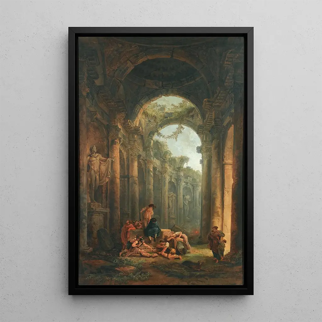 Ruines classiques avec des soldats jouant : taidegrafiikka, joka heijastaa menneisyyden ja leikin yhdistelmää. Tämä Hubert Robertin kiehtova teos vie meidät maailmaan, jossa historia ja luovuus kohtaavat. Majesteettiset rauniot, aikakauden jäänteet, toimivat taustana eloiselle kohtaukselle, jossa sotilaat, täydessä toiminnassa, leikkivät lasten kanssa. Pehmeä valaistus ja lämpimät värit luovat sekä nostalgiaa että iloa huokuvan tunnelman. Tasapainoinen ja dynaaminen sommittelu kutsuu katsojan tutkimaan arkkitehtonisia yksityiskohtia ja kiinnittämään huomiota hahmojen vuorovaikutukseen, paljastaen samalla leikkisän puolen historiasta. Hubert Robert : unelma- ja muistitaitelija Hubert Robert, 1700-luvun ikoni, tunnetaan kyvystään yhdistää todellisuus ja mielikuvitus. Hän sai koulutuksensa kuninkaallisessa maalaus- ja veistokoulussa ja ammensi vaikutteita italialaisilta mestareilta kehittääkseen oman tyylinsä. Hänen teoksensa, usein rauniota ja idealisoituja maisemia sisältäviä, heijastavat kiinnostusta antiikkiin ja luontoon. Hovimaalauksena hän onnistui vangitsemaan aikansa hengen, yhdistäen taitavasti maisemien kauneuden ja arkipäivän kohtaukset. Hänen taiteellinen perintönsä jatkuu, todistaen mielikuvituksen merkityksestä taiteessa. Monipuolinen sisustustarjonta "Ruines classiques avec des soldats jouant" -taidegrafiikan kopio on täydellinen valinta sisustuksen rikastuttamiseen. Olipa kyseessä olohuone, työhuone tai makuuhuone, tämä taidegrafiikka lisää eleganssia ja historiaa tilaan. Tulostuslaatu ja uskollisuus alkuperäisteokselle takaavat vaikuttavan visuaalisen vaikutelman. Sisällyttämällä tämän taideteoksen sisustukseesi luot ympäristöösi taiteellisen ulottuvuuden, joka yhdistää antiikin raunioden kauneuden ja leikin keveyden, luoden harmonisen ja inspiroivan ilmapiirin.
