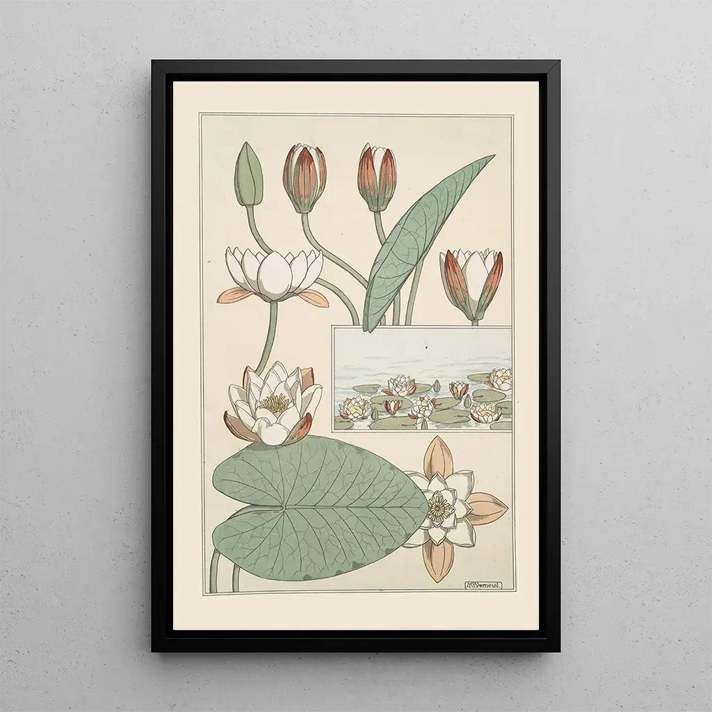 Tässä ikonisessa teoksessa Maurice Pillard Verneuil vangitsee rauhallisen kauneuden kelluvista lootuksista veden päällä. Pastellivärit kietoutuvat hienovaraisesti yhteen, luoden elävän maalauksen, joka herättää rauhan ja harmonian tunteen. Verneuilin impressionistinen tekniikka, joka on luonteeltaan kevyitä ja ilmavia siveltimen vetoja, antaa vaikutelman liikkeestä ja keveydestä, ikään kuin kukat tanssisivat hiljaa tuulen mukana. Tämä koostumus kutsuu katsojan mietiskelyyn, kuljettaen hänet lempeyden ja harmonian maailmaan.