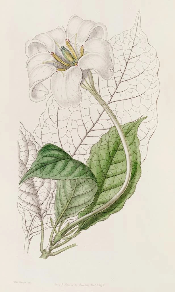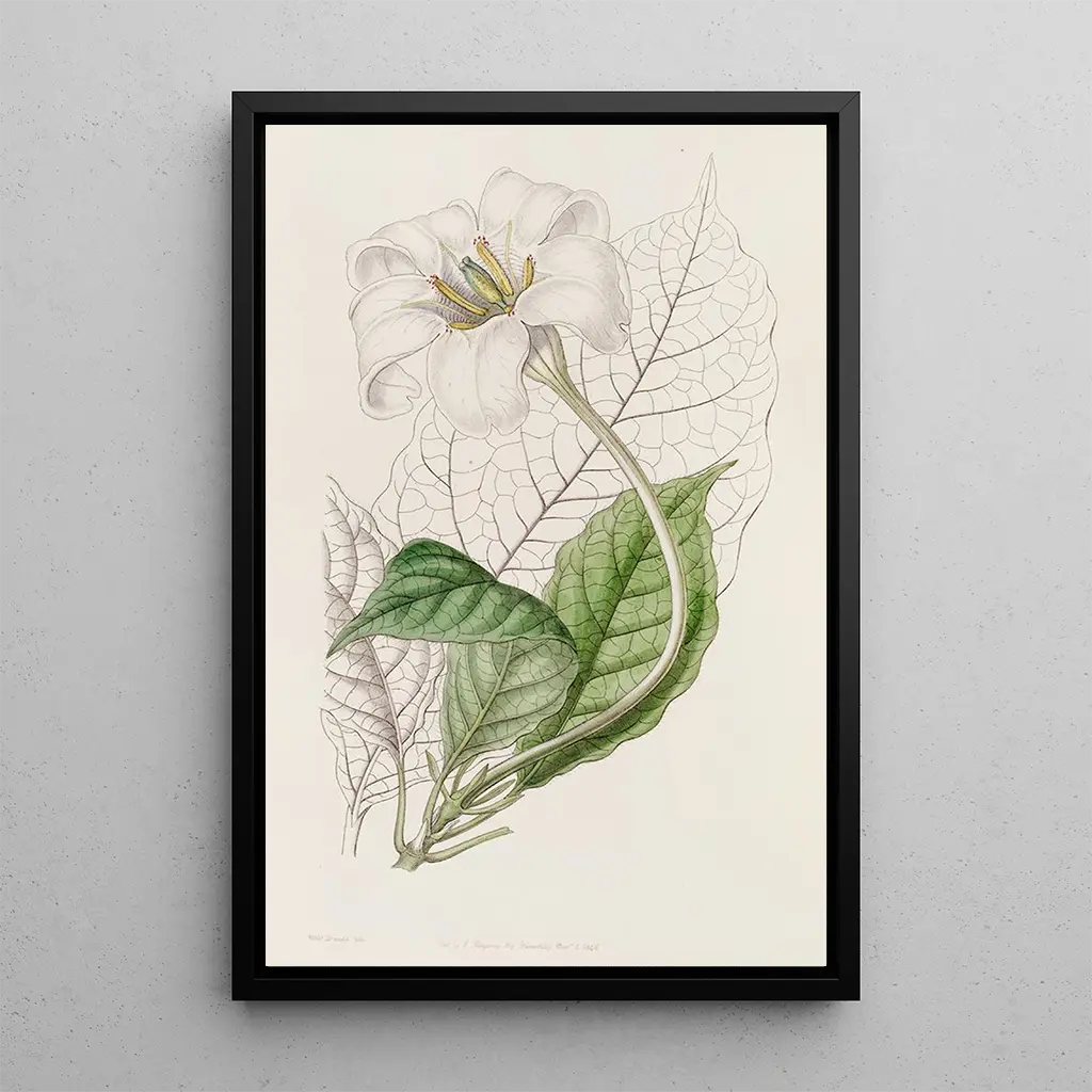 Le gardénia du duc de Devonshire, illustré par Sydenham Edwards, évoque une beauté exquise et une fragrance envoûtante. Les pétales d'un blanc pur, délicatement rehaussés de nuances vertes, se détachent sur un fond subtilement texturé, créant une composition à la fois simple et raffinée. La technique de l'aquarelle permet de rendre la lumière et la transparence des fleurs, offrant une atmosphère sereine et apaisante. Chaque détail, des feuilles aux fleurs, est rendu avec une précision minutieuse, invitant le spectateur à plonger dans l'univers floral.