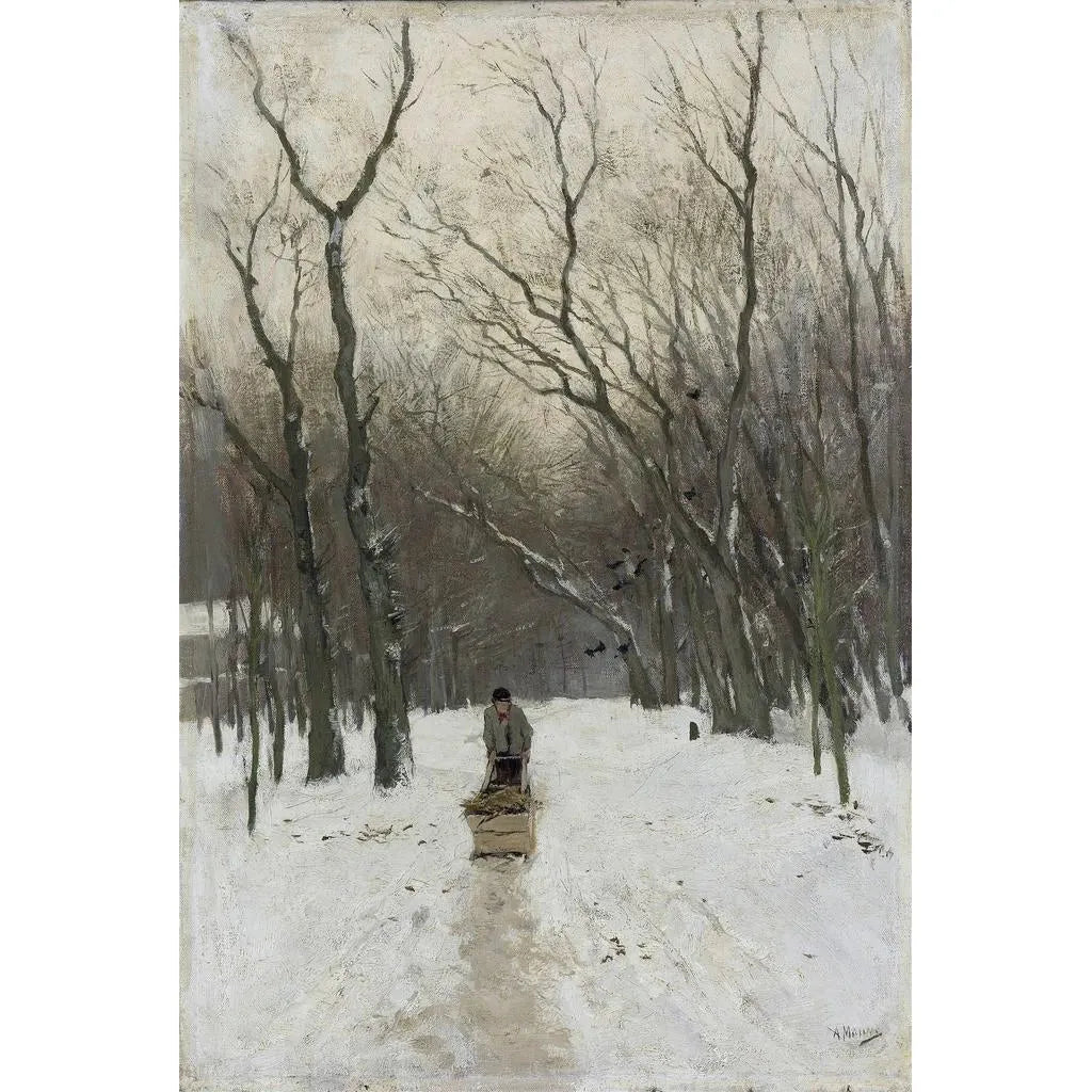 Anton Mauven Hiver dans les bois de Scheveningen -taidegrafiikka tallentaa lumisen maiseman taianomaisuuden, jossa kirkasvalkoinen lumi kontrastoi tummien puunrunkojen kanssa. Rauhallinen ja yksinäinen tunnelma vie katsojan talviseen maailmaan, jossa jokainen lumihiutale vaikuttaa pysähtyneen ajan hetkeltä. Mauve käyttää kylmien värien palettia korostaakseen talven rauhallisuutta, samalla leikkien valolla luoden hienovaraisia varjoja. Tämä teos herättää mietiskelyn hetken, jossa luonnon kauneus paljastuu puhtaimmassa yksinkertaisuudessaan.