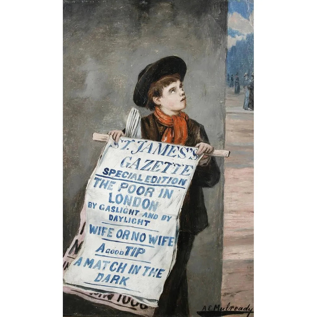 Yleinen art reproduction -juliste, joka esittää Londonin sanomalehtimyyjää, on elävä ja dynaaminen kuva kaupungin arjesta. Lämmintä ja maanläheistä väriä käyttävät sävyt luovat tunnelmallisen ja vilkkaan kaupungin kadun ilmapiirin, kun taas yksityiskohtaiset kasvot ja vaatteet lisäävät autenttisuuden tuntua. Öljyvärityö kankaalle antaa taiteilijalle mahdollisuuden leikkiä valolla, luoden varjoja, jotka antavat syvyyttä kohtaukselle. Jokainen hahmo vaikuttaa kertovan tarinan, kutsuen katsojan uppoutumaan tähän pysäytettyyn hetkeen, jossa aika vaikuttaa pysähtyneen.