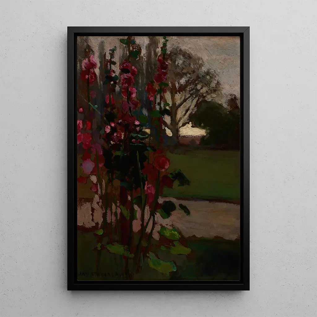 Tässä "Rose trémière Automne polonais" -taidegrafiikka -teoksessa Jan Stanisławski vangitsee kukkien herkkyyden, jotka puhkeavat kukkaan poloneesisen syksyn kultaisessa valossa. Värien eloisuus, syvän punaisista kirkkaisiin keltaisiin, luo vaikuttavan kontrastin vaaleansiniselle taivaalle. Taiteilijan impressionistinen tekniikka ilmenee sulavina siveltimenvedoina, jotka herättävät jokaisen terälehden eloon ja luovat rauhan ja mietiskelyn tunnelman. Teos kutsuu katsojan uppoutumaan pysähtyneeseen hetkeen, jossa luonto paljastaa katoavaisen kauneutensa.