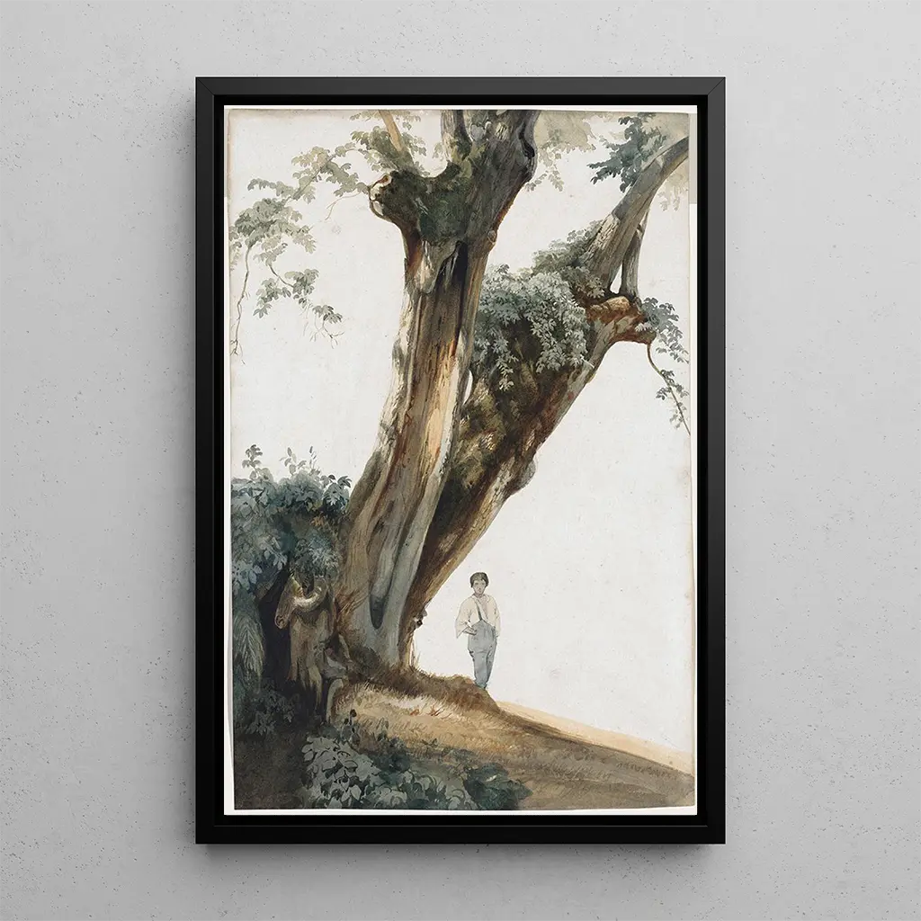 Teoksessa "Arbres anciens dans la campagne romaine" Giovanni Costa johdattaa meidät bucoliseen maisemaan, jossa puiden majesteettisuus sulautuu italialaisen valon lempeyteen. Taulu, rikas vihreän ja ruskean sävyissä, luo rauhallisen ja mietiskelevän tunnelman. Lehtien yksityiskohtainen kuvaus, yhdistettynä kirkkaansiniseen taivaaseen, muodostaa visuaalisen harmonian, joka kutsuu unelmoimaan. Costa'n tekniikka, joka yhdistää impressionismin ja realismin, mahdollistaa kuoren tekstuurin ja lehtien värähtelyn kokemisen, tehden jokaisesta elementistä elävän. Tämä taulu on todellinen kunnianosoitus luonnonkauneudelle, vangiten romaanisen maaseudun olemuksen.