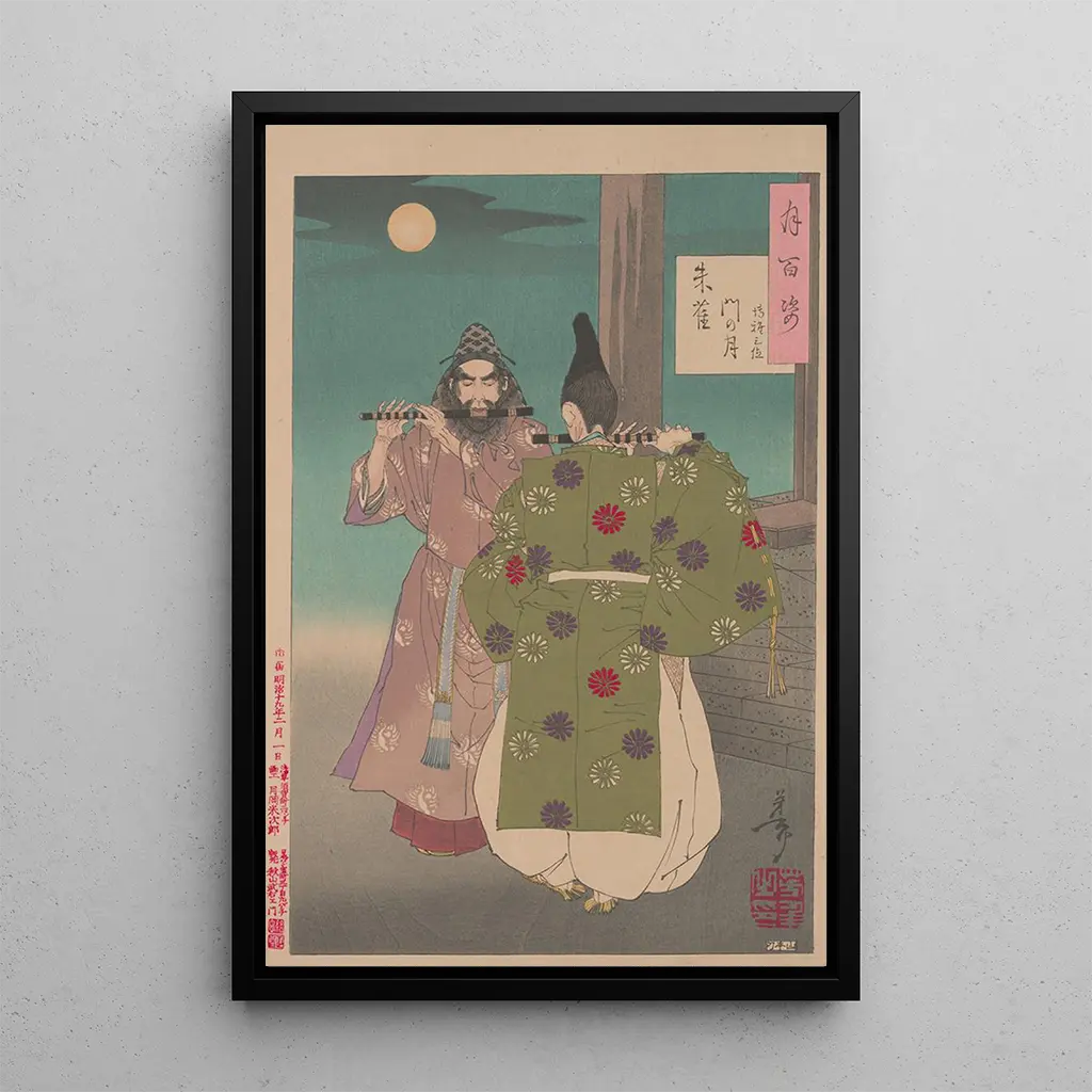 "Lune de la porte Suzaku" on Tsukioka Yoshitoshin ikoniikkainen taidegrafiikka-teos, joka vangitsee kuun valaiseman yön taian. Kompositio esittää herkkää kohtaa, jossa hopeanhohtoinen valo heijastuu luonnon elementteihin, luoden unenomaisen ja rauhallisen tunnelman. Pehmeät värit ja yksityiskohtaiset pienet elementit osoittavat taiteilijan hallitsevan ukiyo-e-kiiltokuvataiteen mestaruutta. Tämä taidegrafiikka ei ainoastaan kuvaa luonnon kauneutta, vaan myös sisäisen rauhan tunnetta, kutsuen katsojan uppoutumaan tämän yökohtauksen pohdintaan.