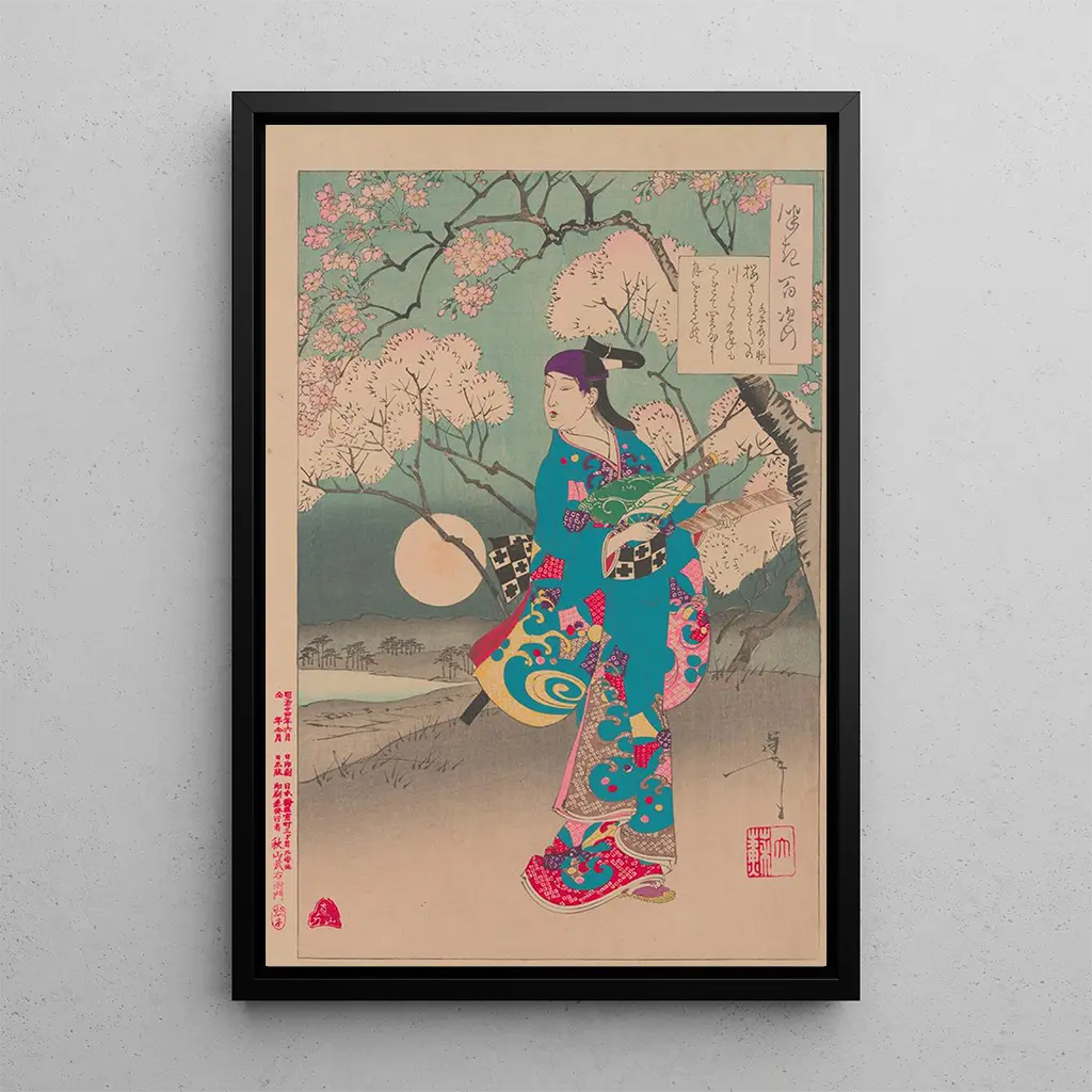 Taidegrafiikka Lune sur la rivière Sumida kuljettaa meidät yöhön, jossa kuun valo tanssii rauhallisten jokien vesillä. Tsukioka Yoshitoshi, ukiyo-e-taiteen mestari, onnistuu vangitsemaan tämän ohikiitävän hetken taian. Hopeiset ja siniset sävyt luovat rauhallisen tunnelman, kun taas veneiden ja ympäröivien maisemien yksityiskohdat lisäävät syvyyttä teokseen. Tämä teos herättää luonnon hetkellisen kauneuden ja kutsuu katsojan ihailemaan japanilaisen yön rauhaa.