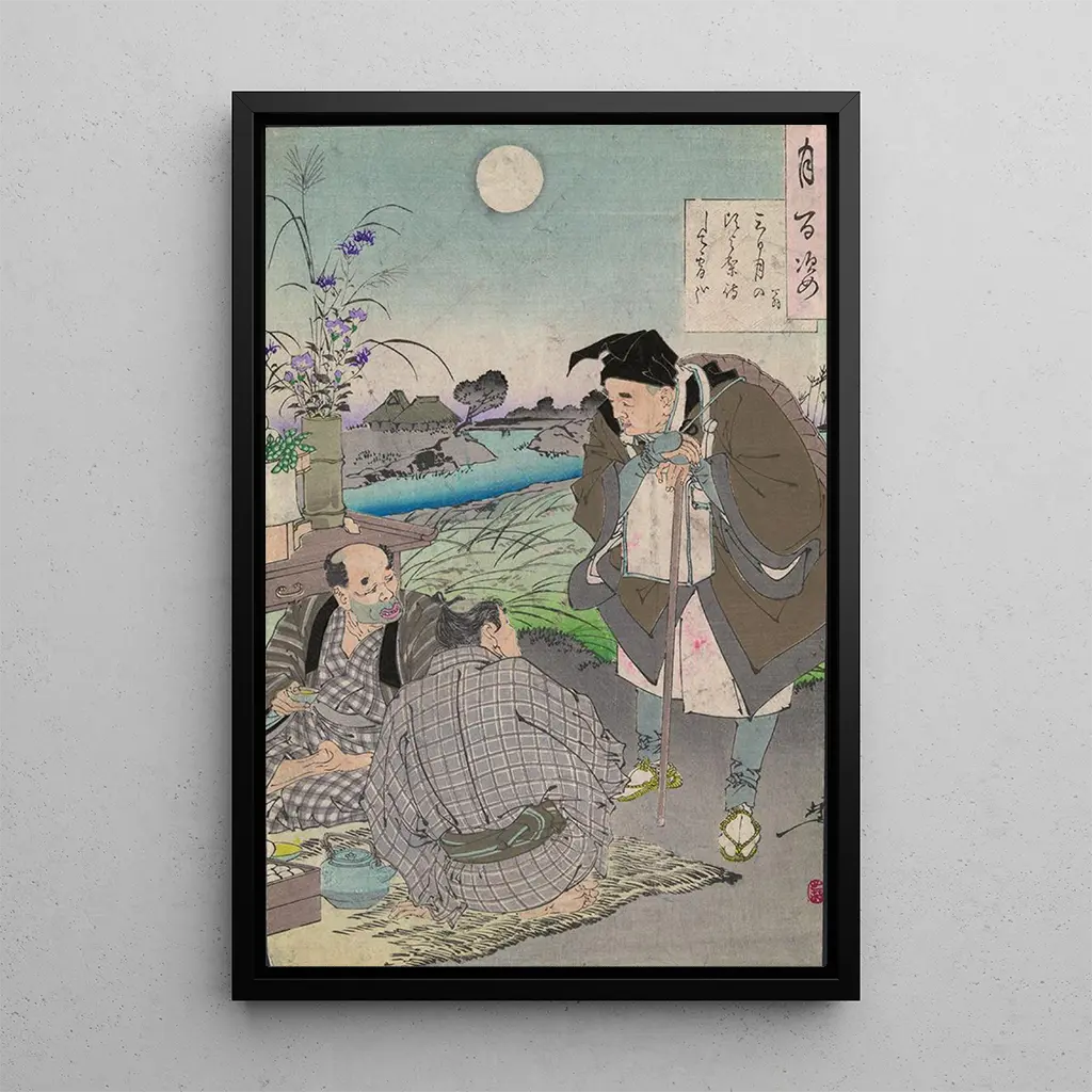 Tässä taidegrafiikassa Tsukioka Yoshitoshi kunnioittaa Matsuo Bashō'ta, haikun mestaria, vangitsemalla hänen runollisen herkkyytensä olemuksen. Hienovaraiset vivahteet ja luonnosta inspiroituneet kuviot luovat rauhallisen ja pohdiskelevan tunnelman. Yoshitoshi, omaleimaisella tyylillään, onnistuu välittämään harmonian ihmisen ja hänen ympäristönsä välillä, mikä on Bashō'n arvostama teema. Tämän teoksen hienostuneet yksityiskohdat osoittavat syvää ihailua elämän ohikiitävästä kauneudesta, kutsuen katsojan pohtimaan yksinkertaisuuden ja syvyyden merkitystä arjen hetkissä.