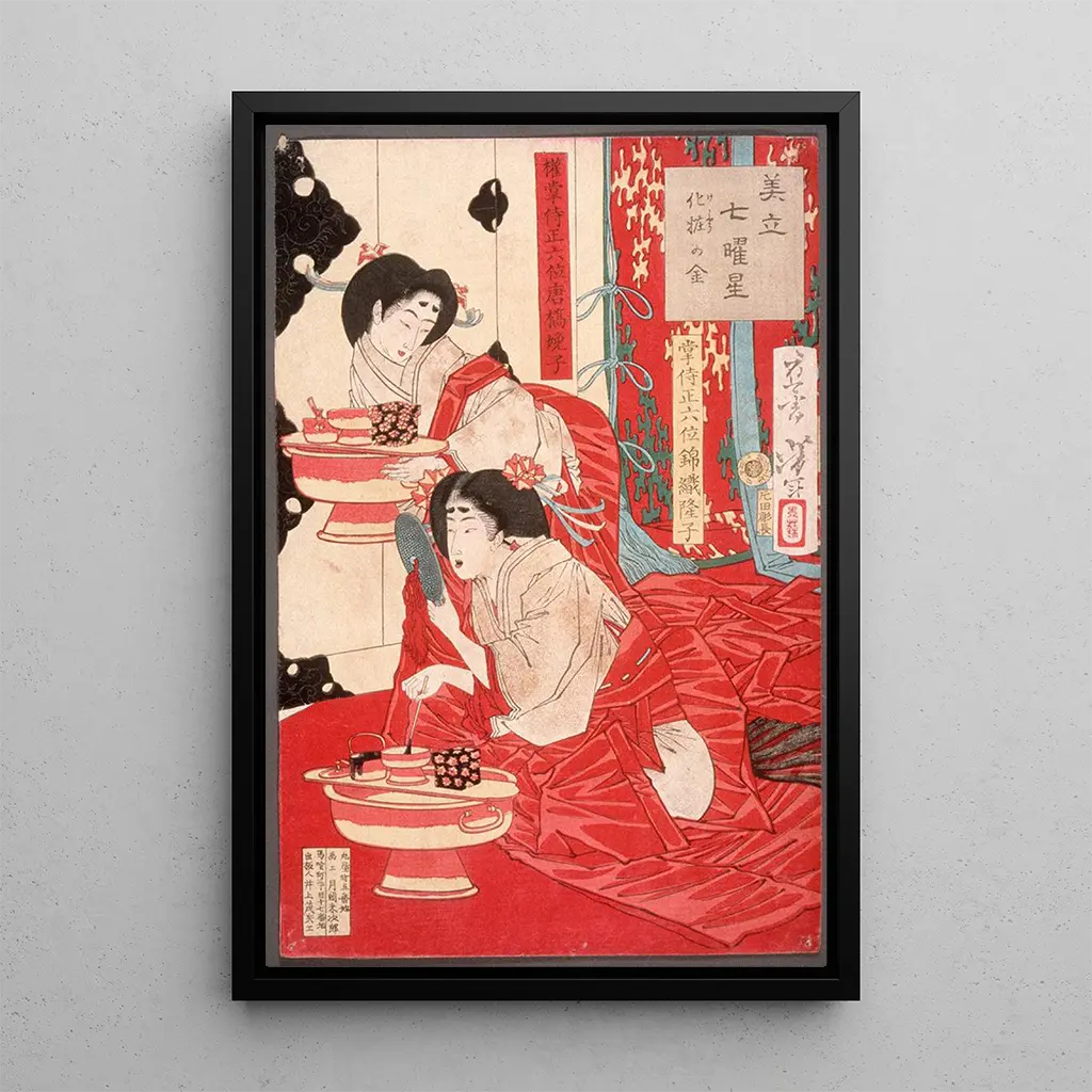Teoksessa "Metallin taidegrafiikka hampaiden tummennukseen" Tsukioka Yoshitoshi johdattaa meidät kiehtovaan maailmaan, jossa kauneus ja kulttuuri sulautuvat yhteen. Tämä taidegrafiikka, joka on täynnä tummia värejä ja huolellisia yksityiskohtia, viittaa perinteiseen japanilaiseen käytäntöön, hampaiden tummennukseen, joka symboloi kauneutta ja sosiaalista statusta. Ukiyo-e-tyylinen paperiprintti antaa tälle teokselle salaperäisen ja vangitsevan tunnelman. Mustan ja kullan sävyt sekä hienovaraiset kuviot kutsuvat syvälliseen pohdintaan tästä ainutlaatuisesta tavasta.