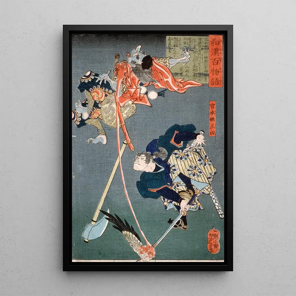 Dans cette œuvre saisissante, Tsukioka Yoshitoshi illustre un moment épique où Miyamoto Musashi se confronte à un tengu, créature mythologique du folklore japonais. La scène, riche en couleurs vibrantes et en détails minutieux, évoque un combat intense, où la maîtrise du sabre de Musashi est mise à l'épreuve. Les nuances de rouge et de bleu, associées à des motifs dynamiques, créent une ambiance à la fois mystique et dramatique. Cette taidegrafiikka du tableau transporte le spectateur dans un monde où légende et réalité se rencontrent, invitant à explorer les récits héroïques du Japon ancien.