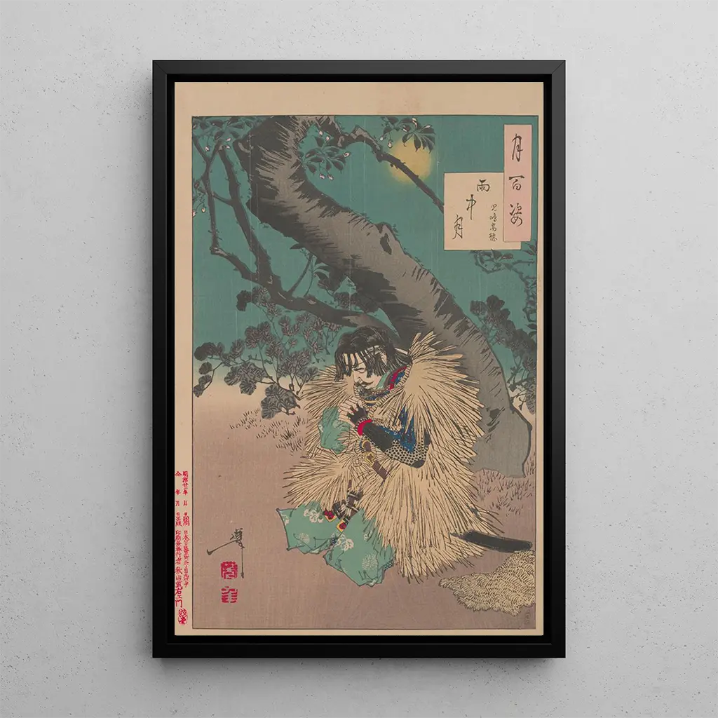 Tsukiokan Yoshitoshin taidegrafiikka Lune pluvieuse herättää melankolian ja rauhan tunnelman. Tässä teoksessa sinisen ja harmaan sävyt sekoittuvat luoden yömaiseman, jossa sade sataa hiljaa ja peittää kohtauksen kevyellä sumulla. Hahmojen hienovaraiset yksityiskohdat, jotka on pukeutunut perinteisiin kimonoon, erottuvat hienovaraisesti tämän salaperäisen taustan vasten. Ukiyo-e-tekniikka, joka on tyypillinen puupiirrokselle, antaa tälle kankaalle syvyyttä ja tekstuuria, jotka vangitsevat katseen. Jokainen sadepisara tuntuu kertovan tarinan, kutsuen katsojan uppoutumaan tähän mietiskelyn hetkeen.