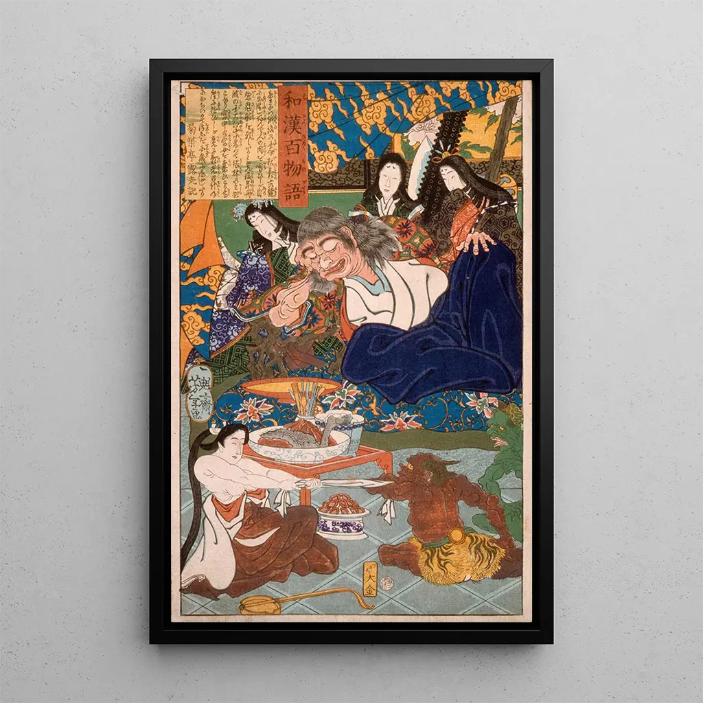 Tässä taidegrafiikka-uutuudessa, jossa Shutendji on naisten ympäröimänä, taiteilija Tsukioka Yoshitoshi johdattaa meidät värien ja tunteiden rikkaaseen maailmaan. Dynaaminen sommittelu korostaa keskushahmoa, legendaarista demonia Shutendjiä, joka on ympäröity naisten kanssa, jotka vaikuttavat sekä lumoutuneilta että pelokkailta. Elävät sävyt ja yksityiskohtaiset japanilaiset perinteiset vaatteet lisäävät syvyyttä kohtaukseen, kun taas hahmojen ilmeet välittävät salaperäisyyden ja jännityksen tunnelmaa. Ukiyo-e-tyylinen puupiirros, joka on tyypillinen japanilaiselle taidegrafiikalle, antaa Yoshitoshille mahdollisuuden leikkiä valon ja varjon kanssa, luoden vaikuttavan visuaalisen efektin.