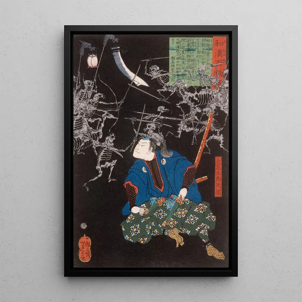 Taidegrafiikka "Tar Mitsukune skelettien tarkkailuna" Tsukioka Yoshitoshilta tarjoaa kiehtovan sukelluksen henkien ja mysteerien maailmaan. Tämä teos, joka on täynnä symboliikkaa, esittää Mitsukunenia, ikonista hahmoa, kasvoillaan skelettiä, viitaten kuoleman ja ylösnousemuksen teemoihin. Tummat värit ja vaikuttavat yksityiskohdat skelettien kontrastina ovat lähes valaisevan Mitsukunenin läsnäolon kanssa, luoden sekä huolestuttavan että kiehtovan ilmapiirin. Lehtitekniikka mahdollistaa tämän kohtauksen esittämisen visuaalisesti vaikuttavalla tavalla, joka houkuttelee katseen ja stimuloi mielikuvitusta.