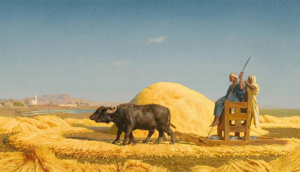 Taiteilija, joka on taustalla teoksessa Egyptin viljankäsittelyt, Viljan puintimiehet Egyptissä, juurtuu taiteelliseen perinteeseen, joka ulottuu useiden vuosituhansien taakse. Muinaisen Egyptin symboliset esitykset ja hienostuneet tekniikat ovat vaikuttaneet moniin taiteilijoihin vuosisatojen aikana. Egyptiläiset freskot, jotka usein sisältävät uskonnollisia ja kulttuurisia merkityksiä, ovat onnistuneet vangitsemaan arjen ja uskomusten ytimen tästä kiehtovasta sivilisaatiosta. Keskittyen maatalouteen liittyviin teemoihin, taiteilija korostaa maatalouden merkitystä egyptiläiskulttuurissa, samalla kun kunnioittaa muinaista taidollista perintöä, joka jatkaa inspiroimista.