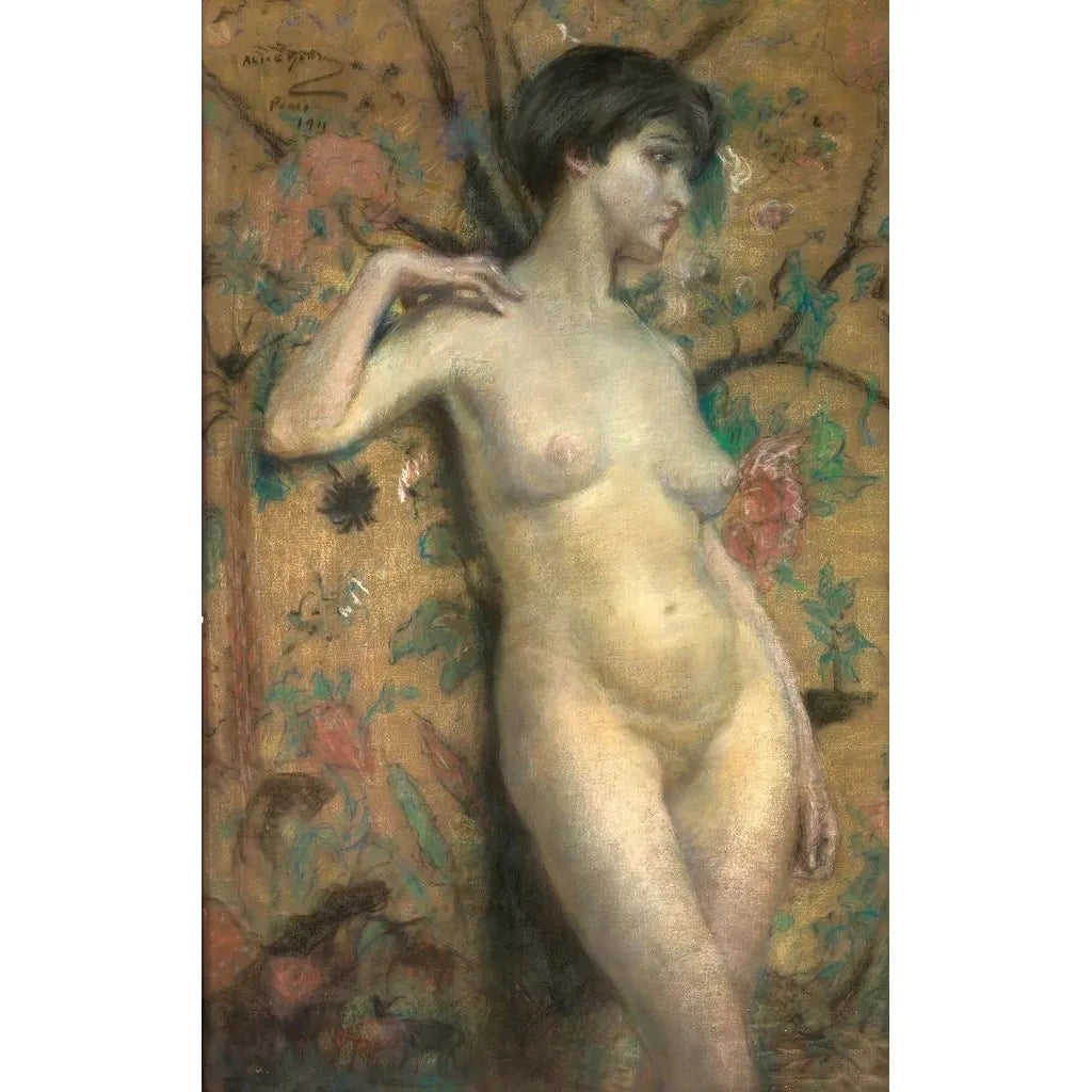Nu edessä liukuva-aitan taidegrafiikassa Alice Pike Barney johdattaa meidät hienostuneisuuden ja sensuaalisuuden maailmaan. Kompositio korostaa naisfiguuria, joka asettuu arvokkaasti kauniisti koristellun liukuva-aitan eteen, luoden vaikuttavan kontrastin alastomuuden ja koristeellisuuden välille. Pehmeät värit ja valon leikit korostavat kehon kaarta, kun taas teksturoitu tausta luo unenomaisen ja mystisen tunnelman. Taiteilijan tekniikka, joka yhdistää realismia ja impressionismia, mahdollistaa kohtauksen lämmön kokemisen kuin todistaisi varastettua intiimihetkeä.