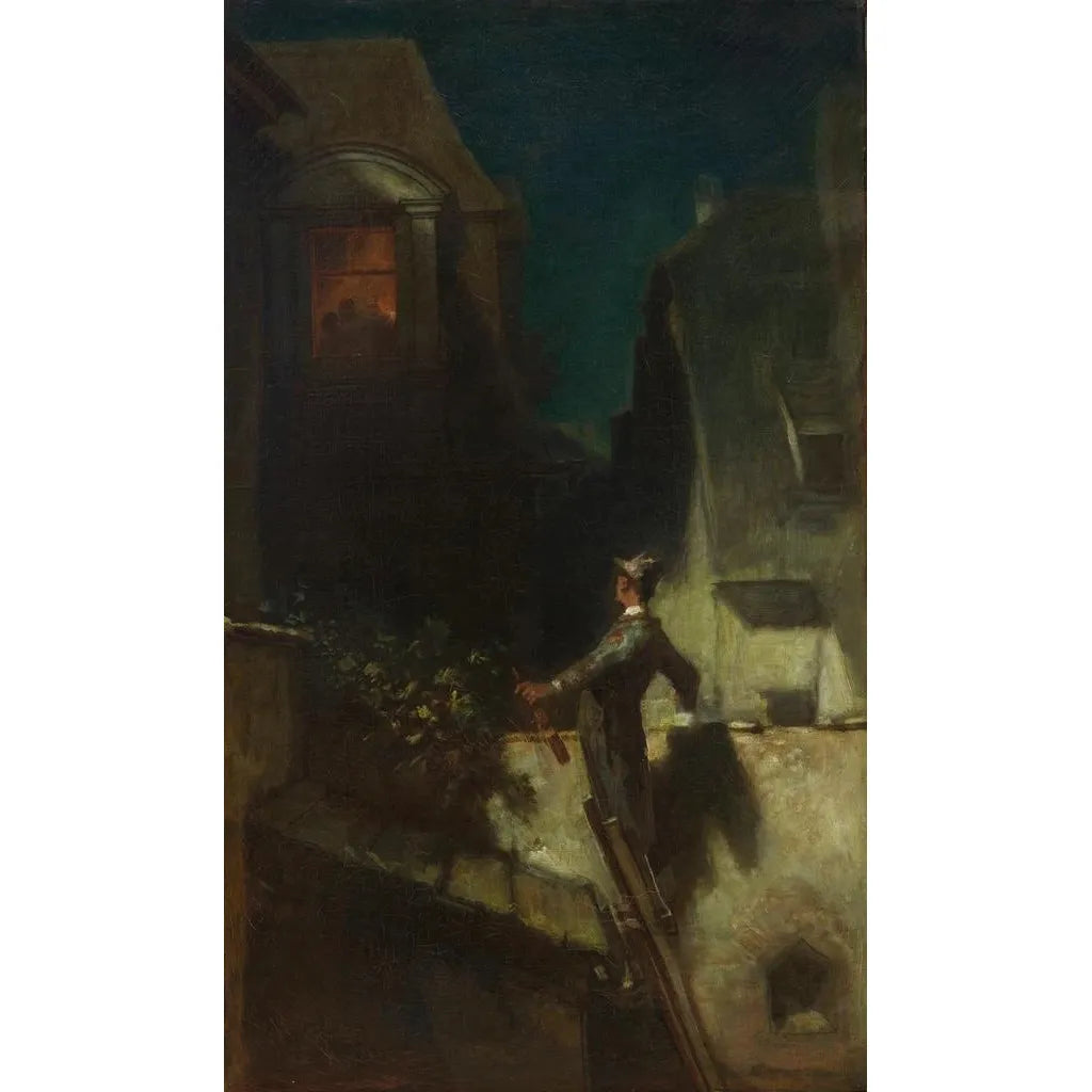Dans cette œuvre captivante, Carl Spitzweg nous plonge dans une atmosphère onirique où un violoniste joue sous la lueur douce de la lune. Les couleurs pastel se mêlent harmonieusement, créant un contraste entre l'obscurité de la nuit et la lumière argentée qui éclaire le musicien. La technique de Spitzweg, caractérisée par des détails minutieux et une touche romantique, évoque une sensation de sérénité et de mélancolie. Chaque élément de la composition, des arbres en arrière-plan aux notes flottantes, contribue à une ambiance poétique, invitant le spectateur à s'immerger dans cette scène musicale.