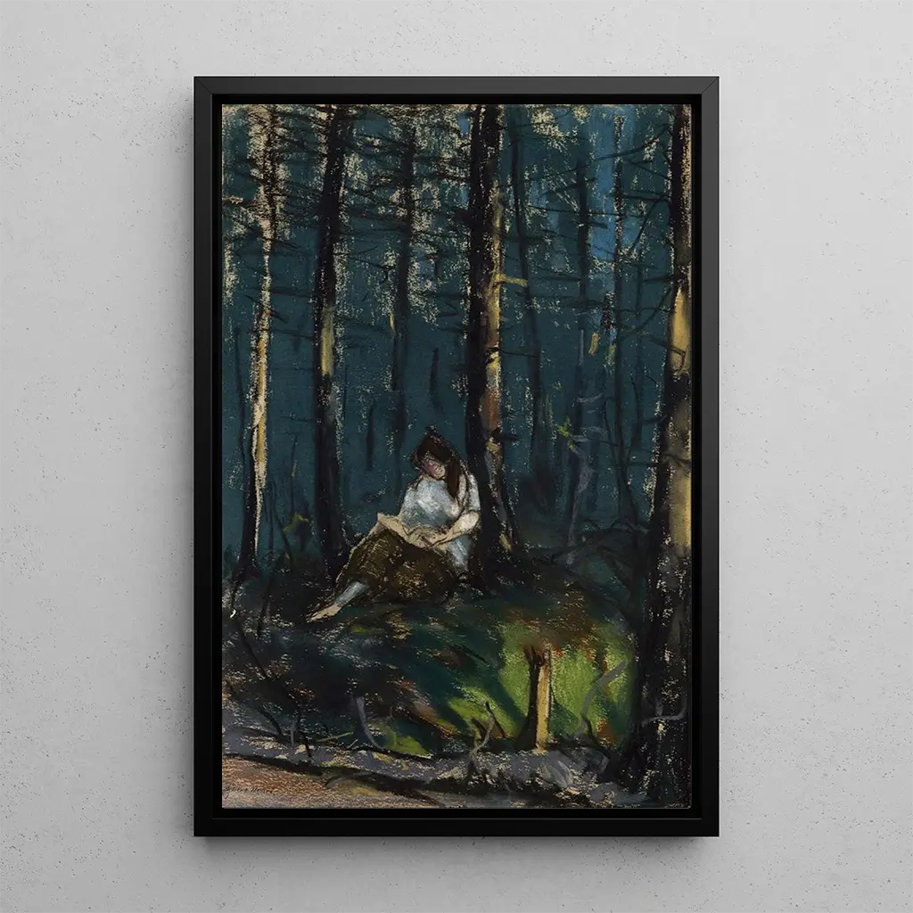Tässä kiehtovassa teoksessa Robert Henri johdattaa meidät metsän sydämeen, jossa lukija vaikuttaa paenneen sanojen ja unelmien maailmaan. Rikkaat ja maanläheiset värit, yhdistettynä valon pilkahduksiin, luovat rauhallisen ja pohdiskelevan ilmapiirin. Taiteilijan tekniikka, joka yhdistää realismin tiettyyn liikkeen vaikutelmaan, herättää tämän intiimin kohtauksen eloon. Lukija, uppoutuneena kirjaansa, symboloi tiedon ja sisäisen rauhan etsintää, kun ympäröivä luonto vaikuttaa ympäröivän häntä lempeydellään.
