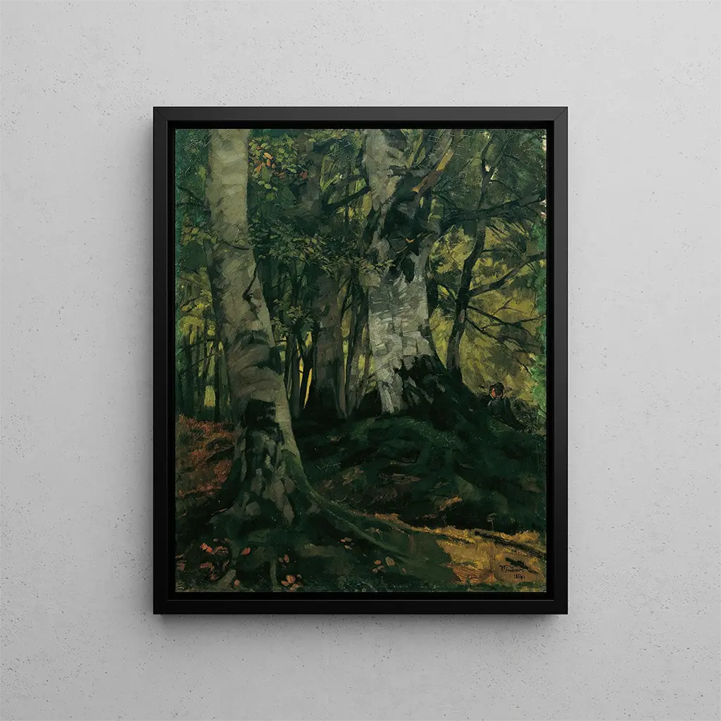 Maailmassa, jossa luonto ja rakkaus kohtaavat, Wilhelm Trübnerin teos "Hiekkadyynien metsällä rakastavaisiden kanssa" kohoaa todellisena ylistyksenä tunteiden kauneudelle. Tämä teos, täynnä romanttista tunnelmaa ja visuaalista herkkäämystä, kuljettaa katsojan maailmaan, jossa majesteettiset puut vaikuttavat vartioivan rakastavaisia. Pehmeä valo, joka suodattuu lehtien läpi, luo varjojen ja valojen leikkiä, kutsuen rauhalliseen pohdiskeluun. Trübner, väri- ja muotokäsityksen mestari, onnistuu vangitsemaan rakkauden ytimen samalla kun hän juhlistaa luontoa kaikessa loistossaan.