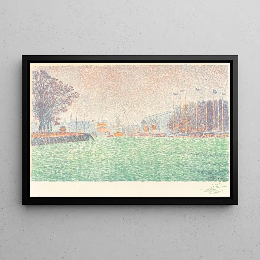 The taidegrafiikka À Flessingue Paul Signacilta on elävä juhla valosta ja väreistä. Tämä kangas, joka on pointillismin liikkeen symboli, kuvaa vilkasta satamaa, jossa veneet keinuvat hiljaa veden päällä. Maalauksen siveltimenvedot, jotka on sovellettu tarkasti, luovat dynaamisen ja elävän ilmapiirin. Signac käyttää rikasta ja kirkasta palettia, leikkien heijastusten ja varjojen kanssa, tuoden kohtauksen eloon. Teos kutsuu tarkastelemaan sävyjä ja tekstuureja, kuljettaen katsojan hetkeksi rauhallisuuteen veden äärellä.