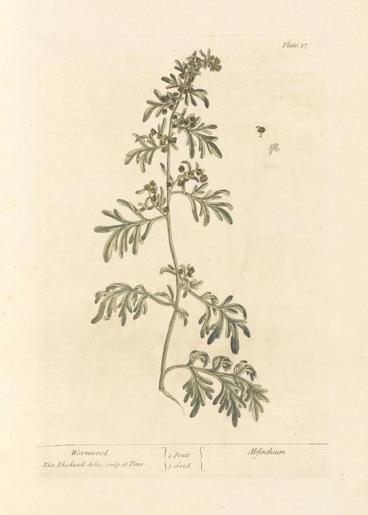 L'œuvre "Absinthe" d'Elizabeth Blackwell on kasvitieteellinen kuva, joka vangitsee tämän ikonisen kasvin olemuksen. Tarkkojen yksityiskohtien avulla Blackwell onnistuu välittämään absintin kauneuden ja monimutkaisuuden, kasvin, johon liittyy usein legendoja ja mysteerejä. Värikkäät ja hienovaraiset vihreän ja keltaisen sävyt luovat sekä rauhoittavan että kiehtovan tunnelman. Taiteilijan käyttämä kuparpiirrosmenetelmä mahdollistaa jokaisen lehden ja varren tarkkuuden, kutsuen katsojan tarkkaavaiseen ja kunnioittavaan luonnon tarkasteluun.