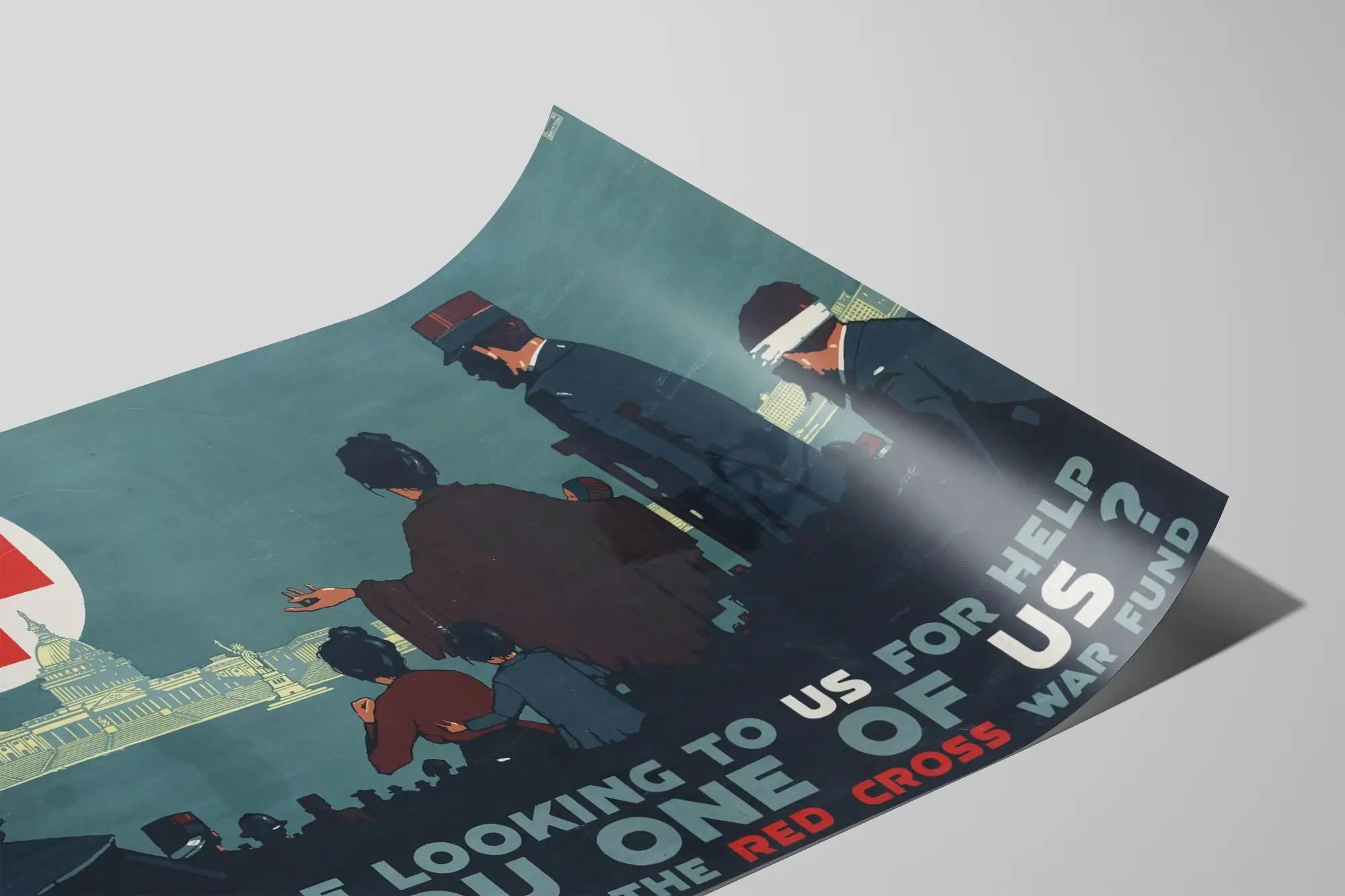 Cette affiche vintage appelle à la solidarité en faveur des blessés de guerre, mettant en avant l'importance de contribuer au fonds de guerre de la Croix-Rouge. Elle représente une scène poignante où plusieurs personnages blessés, dont certains avec des bandages et des béquilles, regardent vers un grand symbole de la Croix-Rouge au-dessus d'un décor urbain. Les silhouettes sombres et expressives s'opposent à un fond bleu-gris, soulignant l'urgence et la nécessité d'une aide collective. Les inscriptions en lettres majuscules, avec des mots clés en rouge, appellent explicitement à l'engagement du spectateur : « They are looking to us for help. Are you one of us? Add your bit to the Red Cross war fund. » Cette affiche est une pièce de décoration murale qui apporte un message fort et historique, idéal pour les passionnés d'histoire ou les amateurs de posters engagés. Son design graphique ancien et ses couleurs contrastées en font un élément décoratif qui attire le regard et invite à la réflexion. Parfait pour enrichir un intérieur d'un style rétro ou vintage, ce poster mural véhicule une émotion puissante et une invitation à la solidarité, symbolisée par la Croix-Rouge et l'appel humanitaire. Une décoration murale originale qui témoigne de la portée symbolique et sociale des affiches durant les périodes de conflit.
