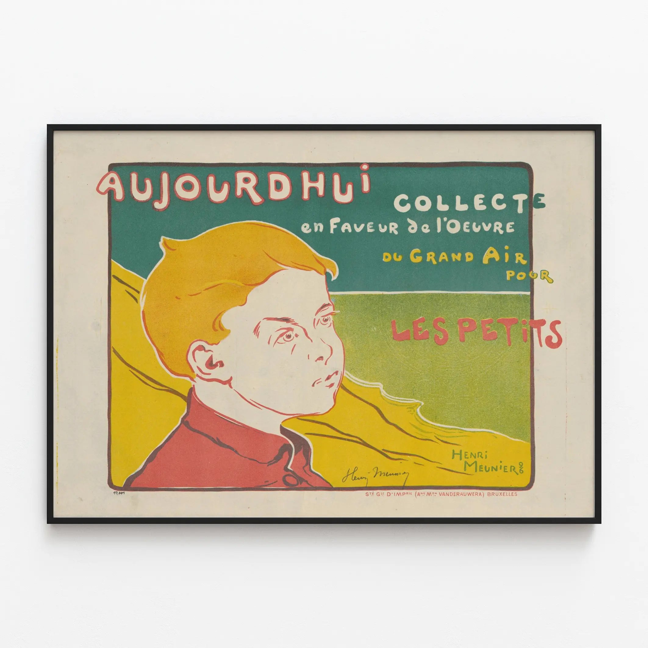 Avec une typographie variée et ludique, les mots "AUJOURD'HUI COLLECTE en faveur de l'œuvre du grand air pour les petits" s'intègrent parfaitement à la composition, soulignant l'appel à la solidarité sans surcharger l'image. Ce tableau graphique, d'inspiration rétro, est idéal pour ceux qui cherchent à enrichir une pièce avec une affiche à la fois esthétique et porteuse de sens.