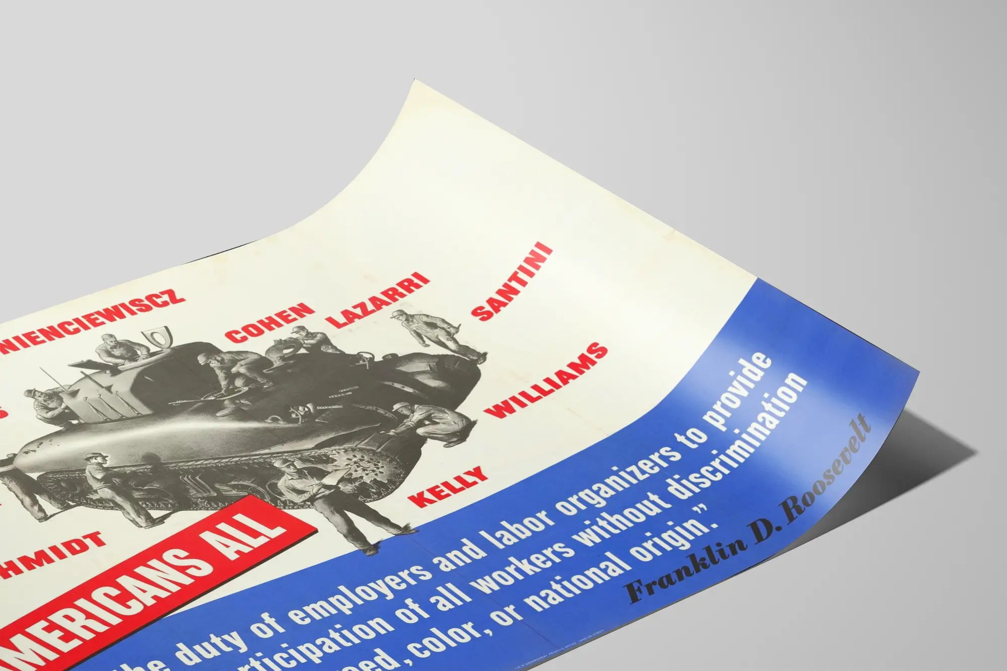 Cette affiche vintage de style propagande met en scène un char d'assaut américain entouré de plusieurs ouvriers en uniforme, illustrant l'effort collectif et la diversité dans le milieu professionnel. Le design graphique combine des illustrations en noir et blanc du char et des ouvriers, avec des noms affichés en lettres rouges pour attirer l'attention sur chaque individu, symbolisant l'inclusion de tous les travailleurs indépendamment de leurs origines. La partie inférieure de l'affiche est dominée par un bloc de couleur bleue avec une citation forte et engagée de Franklin D. Roosevelt, qui souligne l'importance du devoir des employeurs et des organisateurs syndicaux à assurer la participation pleine et entière de tous les travailleurs sans discrimination basée sur la race, la croyance, la couleur de peau ou l'origine nationale. Cette affiche, d'origine étatique américaine, porte une esthétique très marquée des années de la Seconde Guerre mondiale, utilisée pour transmettre un message social fort en faveur de la justice sociale dans le secteur du travail. Parfaite pour enrichir une décoration murale dédiée à l'histoire, à la politique ou à la défense des droits humains, elle constitue une pièce inspirante qui attire le regard et invite à la réflexion. Ce poster de grande taille sera un choix de décoration murale original pour les intérieurs modernes ou rétro, apportant une touche de vintage tout en véhiculant un message puissant et universel. Que ce soit dans un bureau, un atelier ou une salle de conférence, cette affiche vintage ajoute une profondeur historique et sociale à l'espace, tout en étant un hommage visuel à l'engagement contre toute forme de discrimination dans le monde du travail.