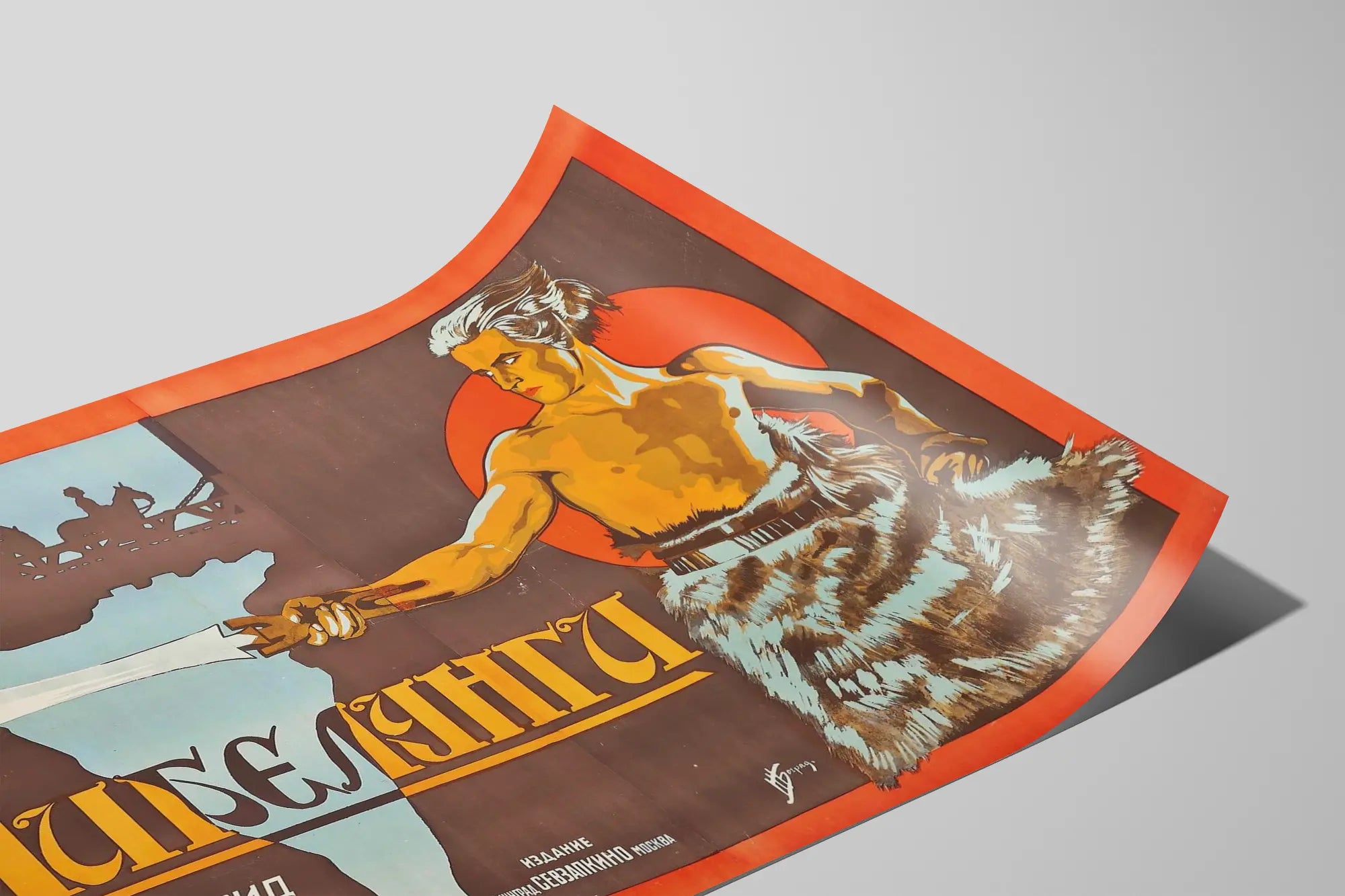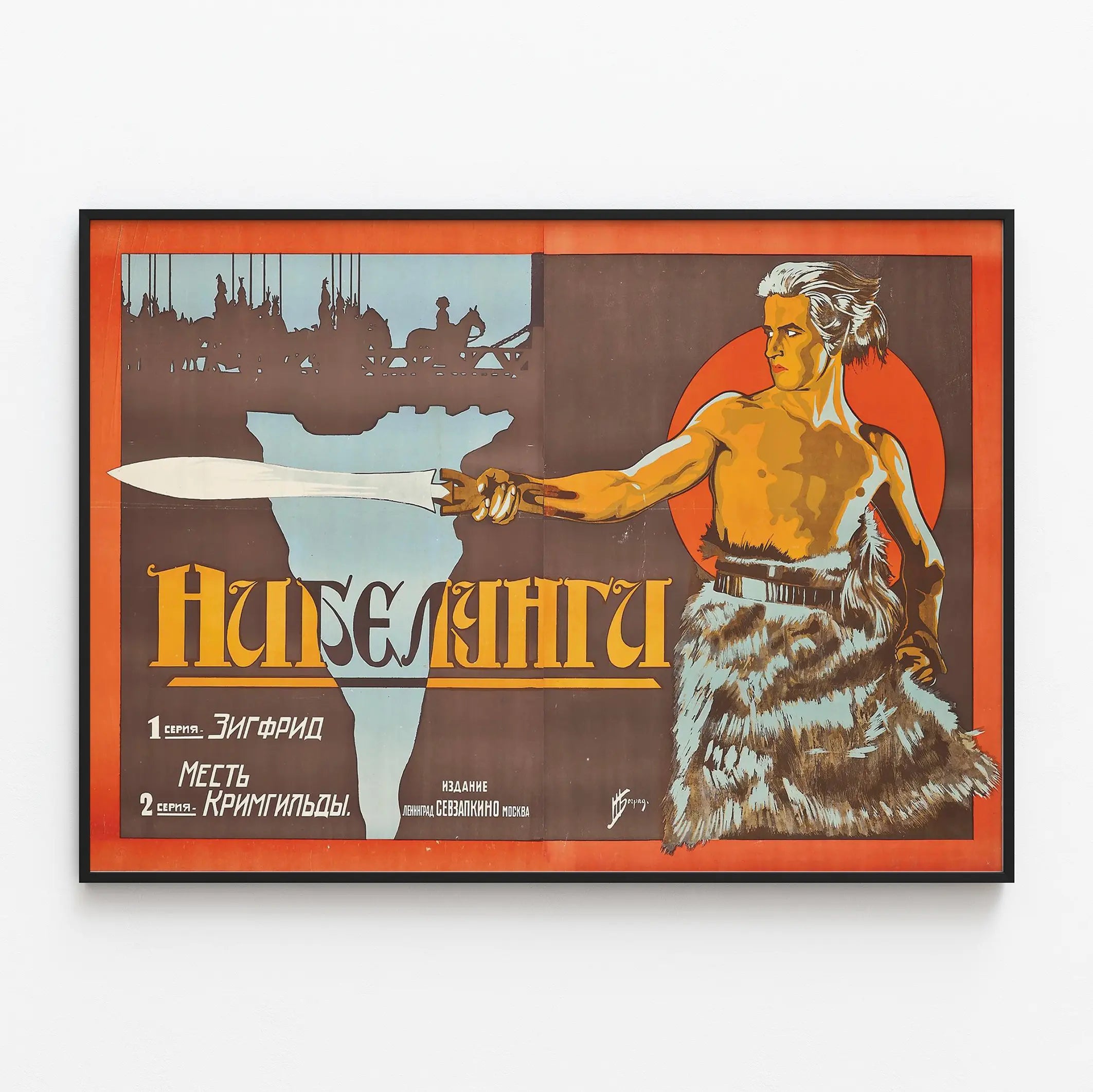 Cette affiche vintage exceptionnelle représente une scène forte et évocatrice tirée de l'univers légendaire des Nibelungen. Au centre, un guerrier imposant, vêtu d'une peau d'animal, brandit une épée blanche avec détermination. Son visage est marqué par une expression de concentration et de force. Le fond dévoile une silhouette en ombre chinoise représentant une cavalcade sur un pont, contrastant avec une large forme bleutée et un cercle rouge vibrant qui encadre le personnage principal. Cet élément graphique saisissant, aux teintes principalement marron, rouge, orange et bleu pâle, agrémente parfaitement la composition de cette œuvre murale, destinée à tous ceux qui souhaitent insuffler à leur espace une ambiance épique et dramatique. L'affiche évoque le monde des dieux et héros mythologiques, idéal pour une décoration murale inspirante dans un salon, une bibliothèque ou même un bureau où le caractère et la mythologie seraient mis à l'honneur. Le style graphique, qui mêle modernité dans la mise en scène et classicisme dans le rendu, donne à cette décoration murale une touche rétro tout en restant élégante et dynamique. L'inscription en alphabet cyrillique accroît le mystère et l'authenticité de ce poster historique, parfait pour les amateurs d'art graphique, de culture légendaire et de design vintage. Ce poster est une pièce maîtresse pour ceux qui aiment décorer leurs murs avec des œuvres qui racontent une histoire, combinant symbolisme et esthétique. Chaque détail, de l'épée étincelante au drapé texturé de la peau, souligne un souci d'harmonie et de force visuelle, garantissant un impact notable dans tout intérieur contemporain ou classique. Ce tableau mural s'adapte aussi bien à des environnements masculins ou neutres recherchant une décoration distinctive et audacieuse. Intégrez cette affiche à votre collection de décoration murale pour un rendu à la fois artistique et mythologique, qui capte l'attention et valorise votre espace de vie ou de travail. Elle incarne l'esprit des récits épiques et la puissance des personnages légendaires, tout en apportant une touche vintage unique.