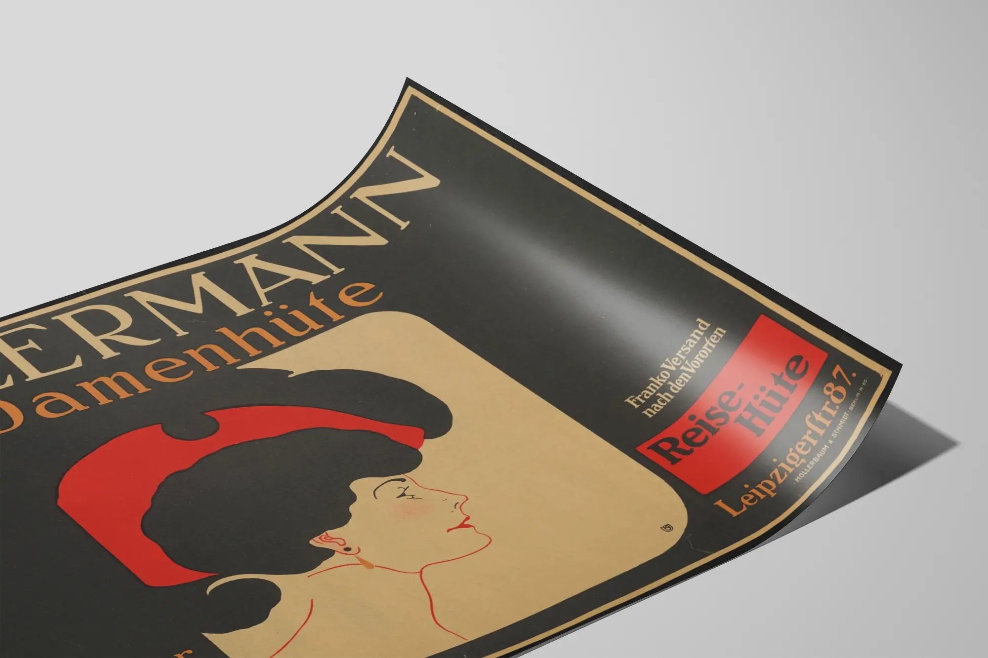 Cette affiche vintage Ehlermann est une pièce idéale pour sublimer votre décoration murale avec une touche de style rétro. Représentant une silhouette féminine élégante, elle met en avant des chapeaux féminins (Damenhüte), un accessoire de mode classique qui évoque l'élégance et le raffinement d'une autre époque. Cette affiche publicitaire est réalisée dans un style graphique typique, combinant un fond noir avec des nuances sobres et un jeu de couleurs contrastées en rouge et beige, qui attire naturellement le regard.