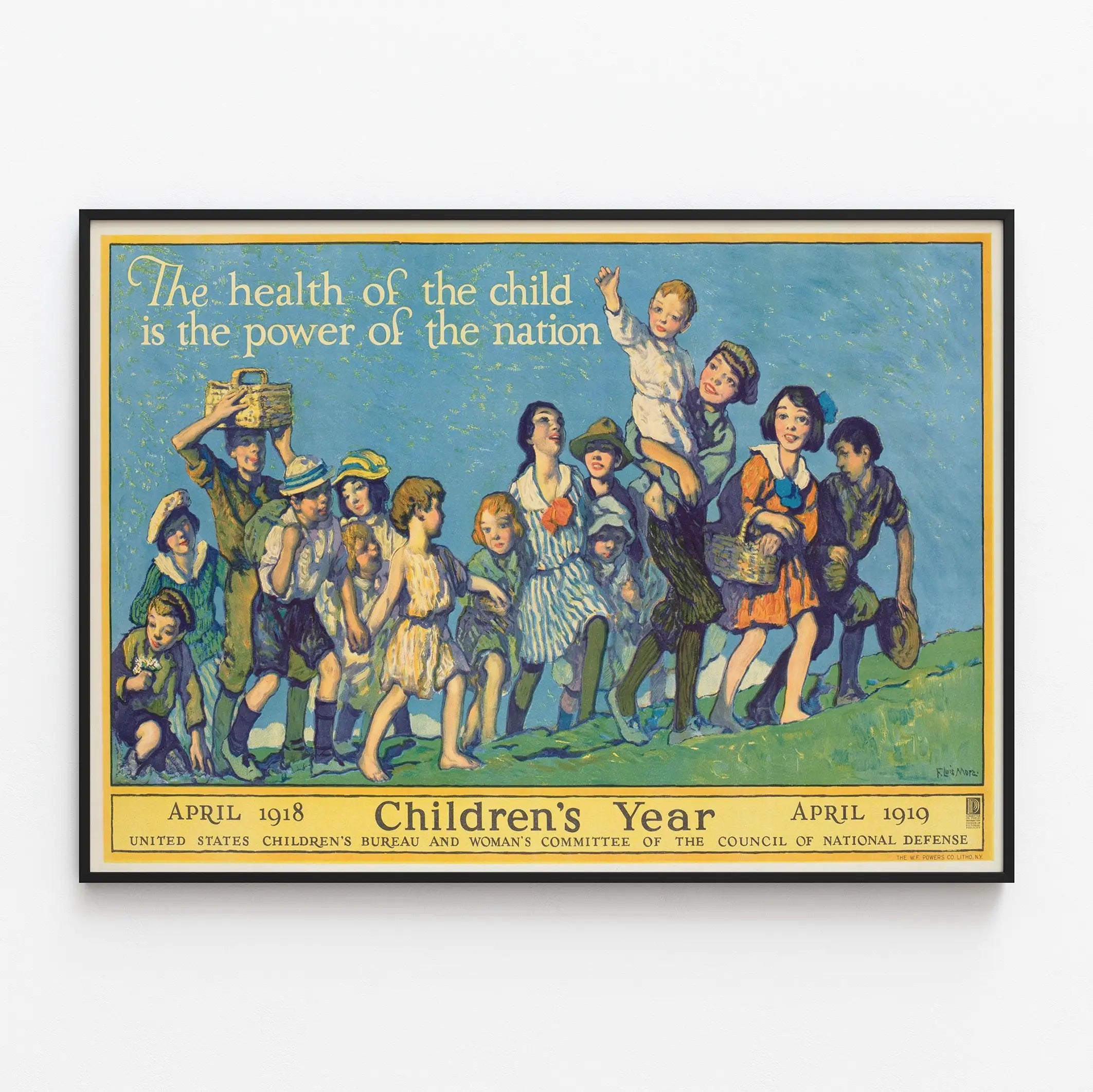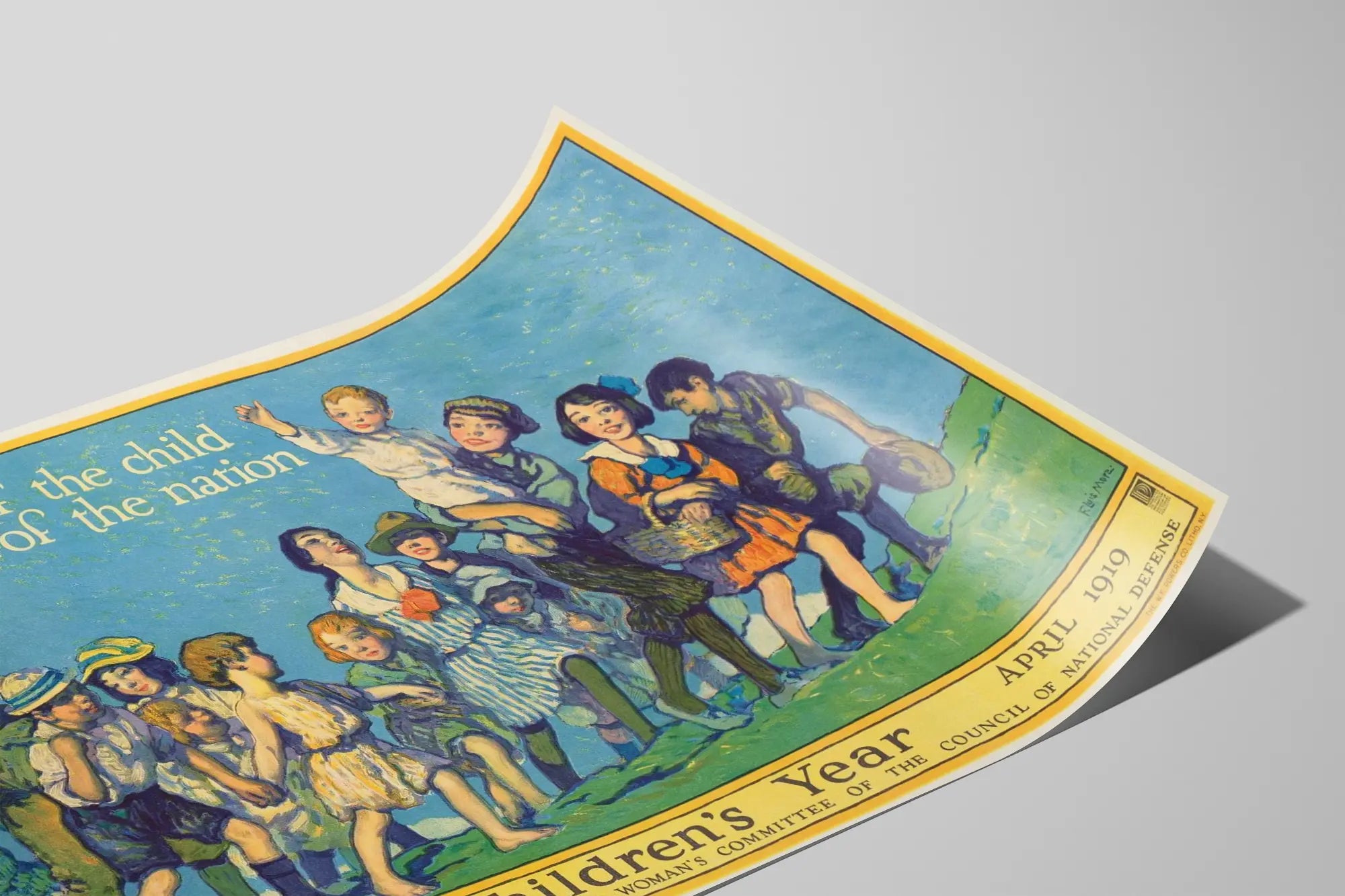 Cette affiche vintage intitulée "Children's Year" est une décoration murale au style rétro qui met en avant l'importance de la santé des enfants comme pilier du futur d'une nation. Datant d'avril 1918-1919, ce poster illustre une scène joyeuse où plusieurs enfants marchent ensemble sur une colline sous un ciel bleu. La phrase "The health of the child is the power of the nation" attire l'attention sur le thème central de la santé infantile et de son rôle fondamental pour le bien-être collectif. Avec un rendu graphique aux couleurs vibrantes et aux traits précis, cette affiche est particulièrement adaptée pour une décoration murale dans des espaces dédiés à l'enfance, à la pédagogie ou à la santé. Elle peut aussi s'intégrer avec charme dans un salon, bureau ou espace culturel affichant une ambiance vintage ou historique. L'image dégage une atmosphère d'optimisme et d'espoir à travers la représentation d'enfants en mouvement, habillés de façon simple et colorée, illustrant à la fois innocence et dynamisme. En tant que poster mural, elle se prête aussi bien à des impressions sur papier de haute qualité qu'à une mise en valeur sous cadre afin de protéger la pièce et renforcer son esthétique. C'est une proposition idéale pour les amateurs de décoration murale à thème historique ou éducatif, souhaitant apporter une touche d'authenticité et de signification dans leur environnement. Les détails soignés et le style illustratif sont les atouts majeurs de ce tableau mural exprimant un message durable sur le rôle crucial de la santé des enfants dans la société. Parfaite pour être offerte ou pour compléter une collection d'affiches vintage, cette décoration murale évoque une époque tout en transmettant un idéal toujours d'actualité. Ce poster est un véritable hommage visuel à la jeunesse et à sa valeur, qui se démarque par son esthétique classique et son message puissant et universel.