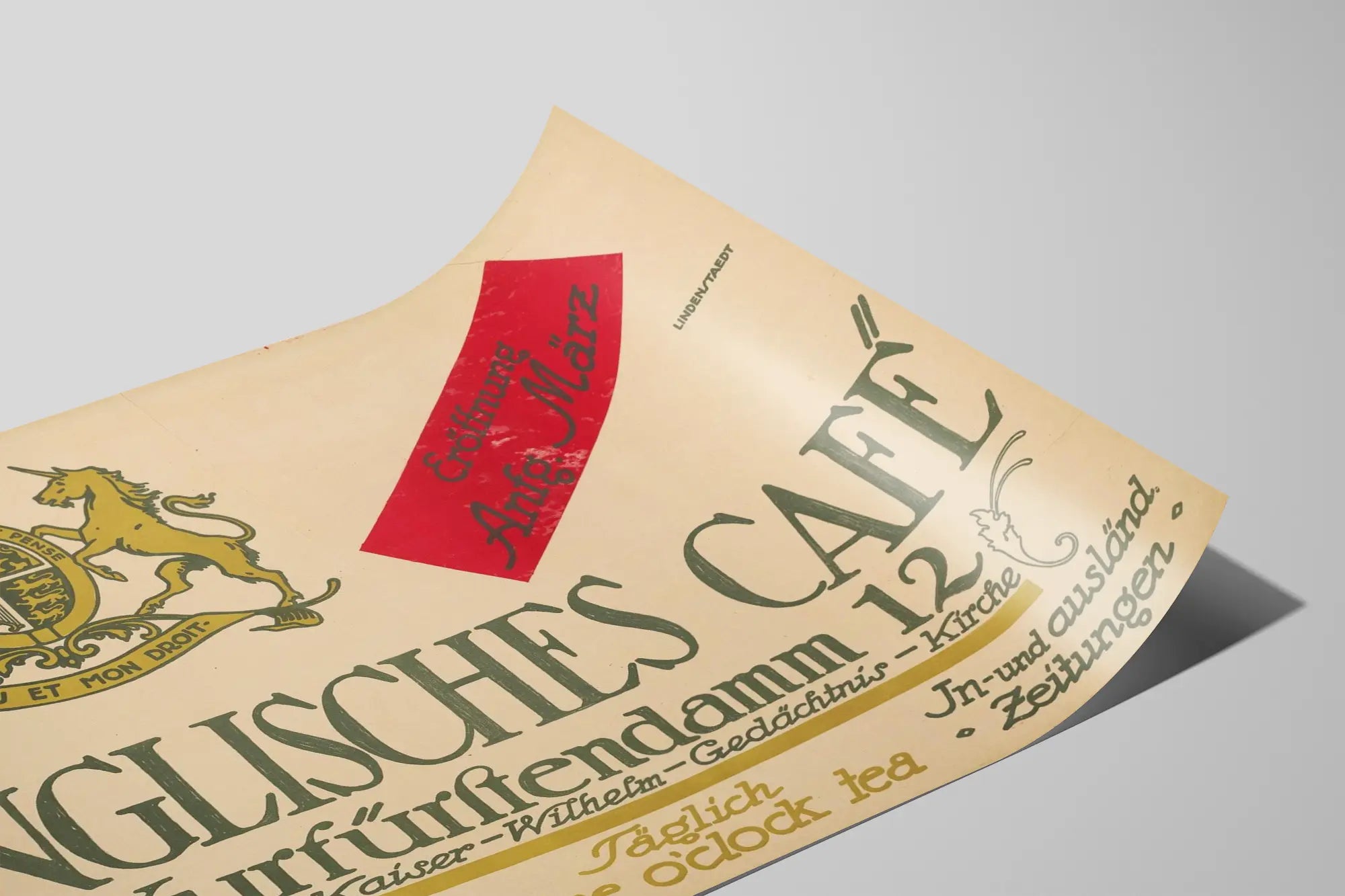 Découvrez cette affiche vintage qui présente l'Englisches Café situé au 12 Kurfürstendamm, un lieu chargé d'histoire et d'élégance. Ce poster met en avant un design graphique typique d'une époque passée, combinant une typographie artistique à un blason orné d'un lion et d'une licorne, symboles emblématiques royaux, pour une décoration murale unique et pleine de caractère. L'affiche annonce l'ouverture du café et met en valeur ses prestations, telles qu'un concert artistique, des salles de jeux et billard, ainsi que la tradition du thé à cinq heures. Son style rétro et ses éléments calligraphiques en noir et doré sur fond beige apportent une touche de charme et d'authenticité à tout espace. Cette décoration murale est idéale pour les amateurs d'art graphique ancien ou pour apporter une atmosphère britannique classique à votre intérieur. En tant que poster, elle peut être encadrée pour un effet tableau mural sophistiqué ou simplement apposée pour habiller un mur avec un accent vintage. Parfaite pour une pièce à vivre, un café, un bureau ou un espace culturel, cette affiche offre une immersion visuelle dans l'ambiance des cafés historiques et des traditions européennes du début du XXe siècle. Optez pour cette pièce décorative pour enrichir votre intérieur grâce à une affiche originale mêlant histoire, élégance et design graphique distinctif.