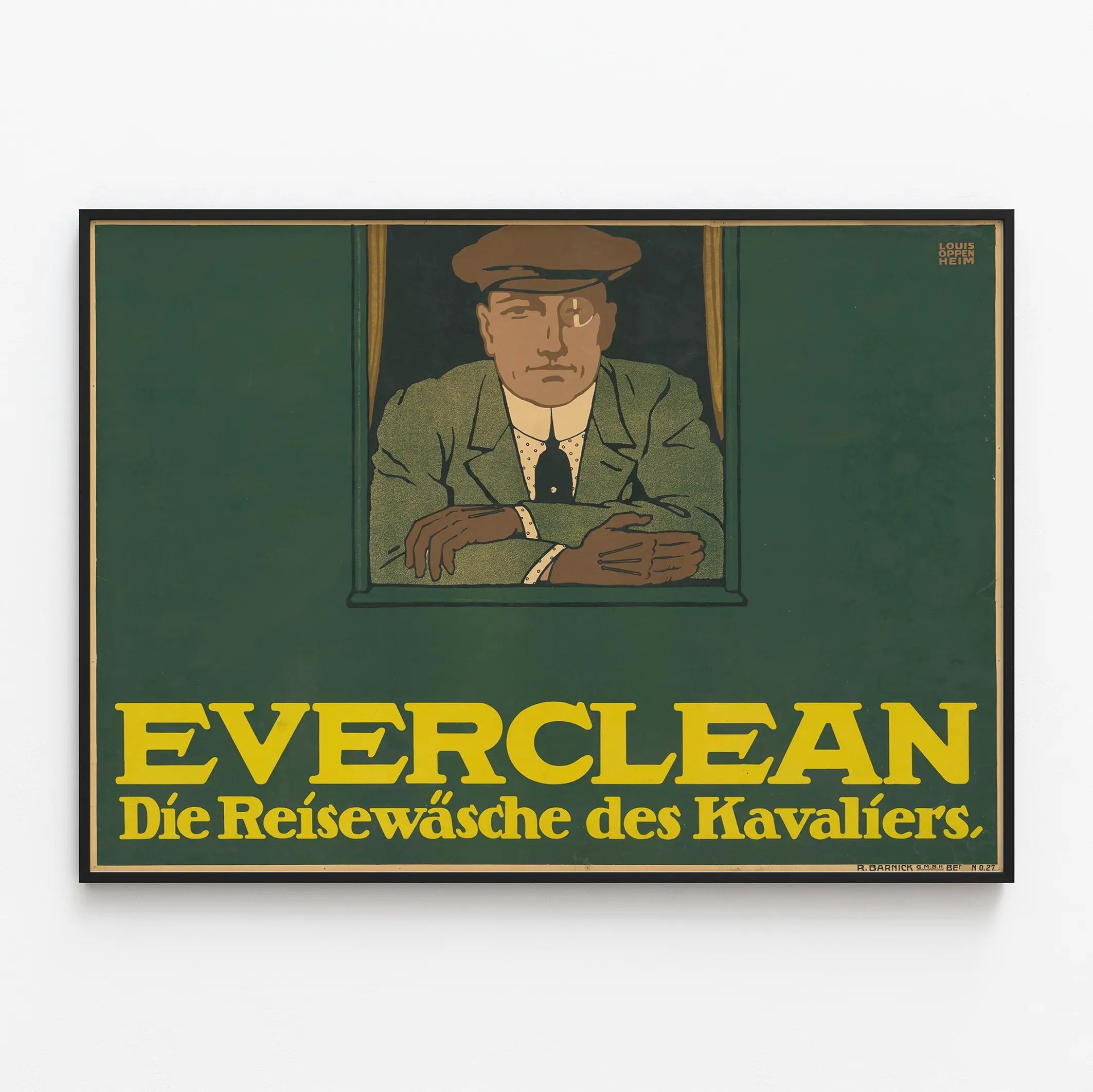 Découvrez cette affiche vintage au style art déco qui met en avant le produit Everclean, dédié aux lessives de voyage. Cette décoration murale présente un homme sobrement vêtu, encadré par une fenêtre, dans des tons verts et ocres. Le contraste entre le fond sombre et le texte jaune vif attire l'œil sur le message publicitaire, soulignant la fonction pratique de cette lessive pour les voyageurs. Ce poster rétro est une pièce idéale pour une décoration murale originale, apportant une touche d'élégance et d'authenticité à votre intérieur. Que ce soit accroché dans un salon, un bureau ou une buanderie, cet affichage mural apporte un charme ancien et un clin d'œil au design graphique du début du XXe siècle. Son style épuré et son iconographie soignée en font un élément décoratif unique qui ravira les amateurs de posters publicitaires et d'objets vintage. Intégrez cette affiche dans votre collection pour une ambiance au croisement de l'histoire du design et de la décoration murale contemporaine.