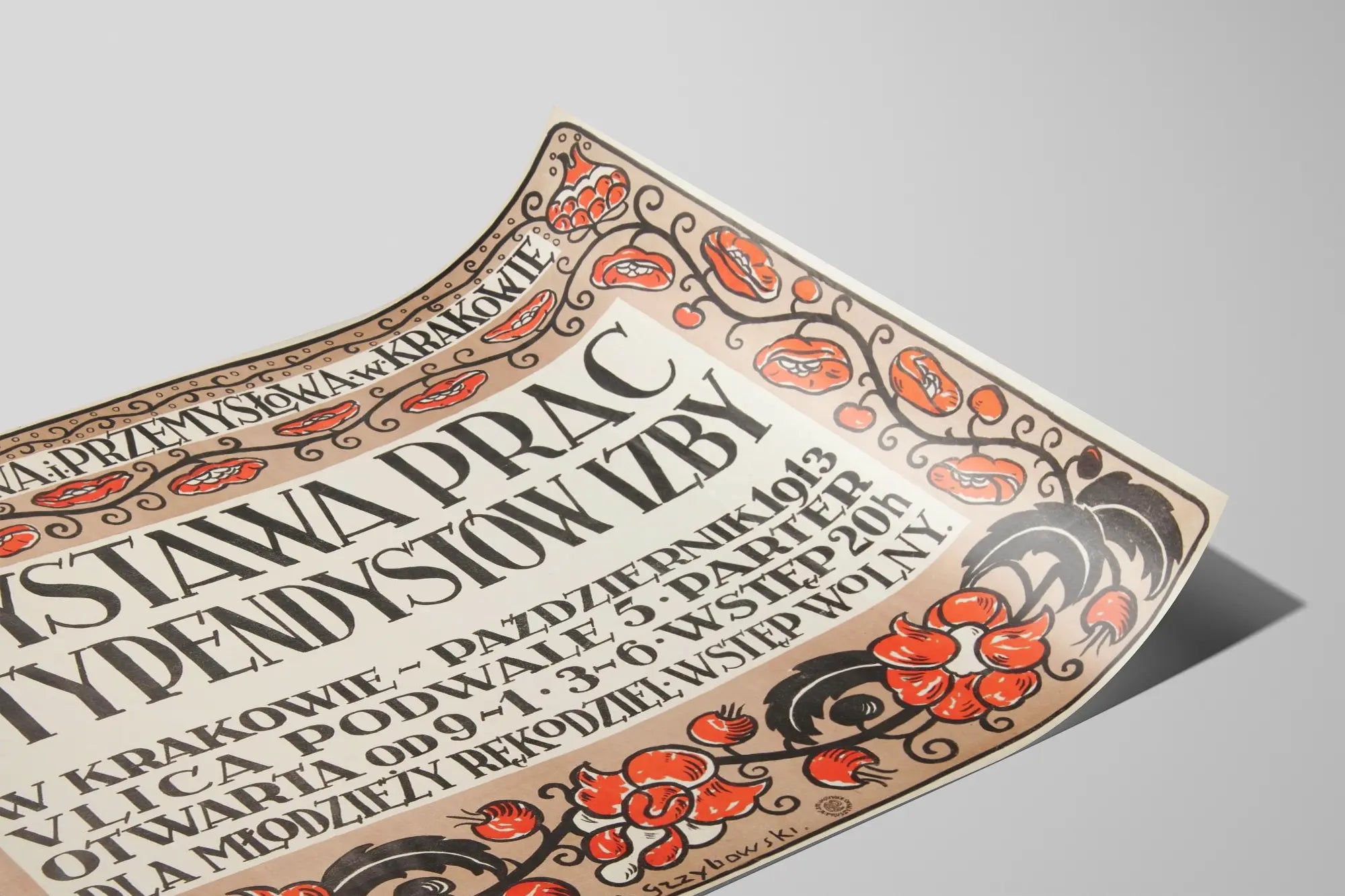 Cette affiche vintage est une pièce décorative murale unique qui annonce une exposition artistique organisée par l'Izba Handlowa i Przemysłowa à Cracovie. Elle est ornée d'un superbe encadrement floral stylisé aux couleurs rouge-orangées et noires, qui accentue son caractère artisanal et authentique. Le texte central, en lettres capitales denses et dessinées à la main, met en avant 'Wystawa Prac Stypendystów Izby' : une exposition des travaux des bénéficiaires d'une bourse, reflétant une ambiance artistique et historique. Cette affiche ancienne présente des informations détaillées sur le lieu de l'exposition, situé à Cracovie, ainsi que les horaires d'ouverture, conférant à ce poster une valeur documentaire et culturelle notable. Parfait pour une décoration murale chaleureuse, cette affiche apportera une touche vintage et artisanale à tout intérieur. Son style graphique et son design évoquent un savoir-faire traditionnel, idéal pour les amateurs d'art décoratif recherchant des pièces uniques qui racontent une histoire. Ce poster est une invitation à découvrir ou remémorer une manifestation artistique locale dans un cadre prônant la créativité et le soutien aux jeunes talents. Accroché dans un salon, un bureau ou une galerie, il constitue un élément de décoration murale capturant l'esprit d'une époque et d'une communauté artistique spécifique.