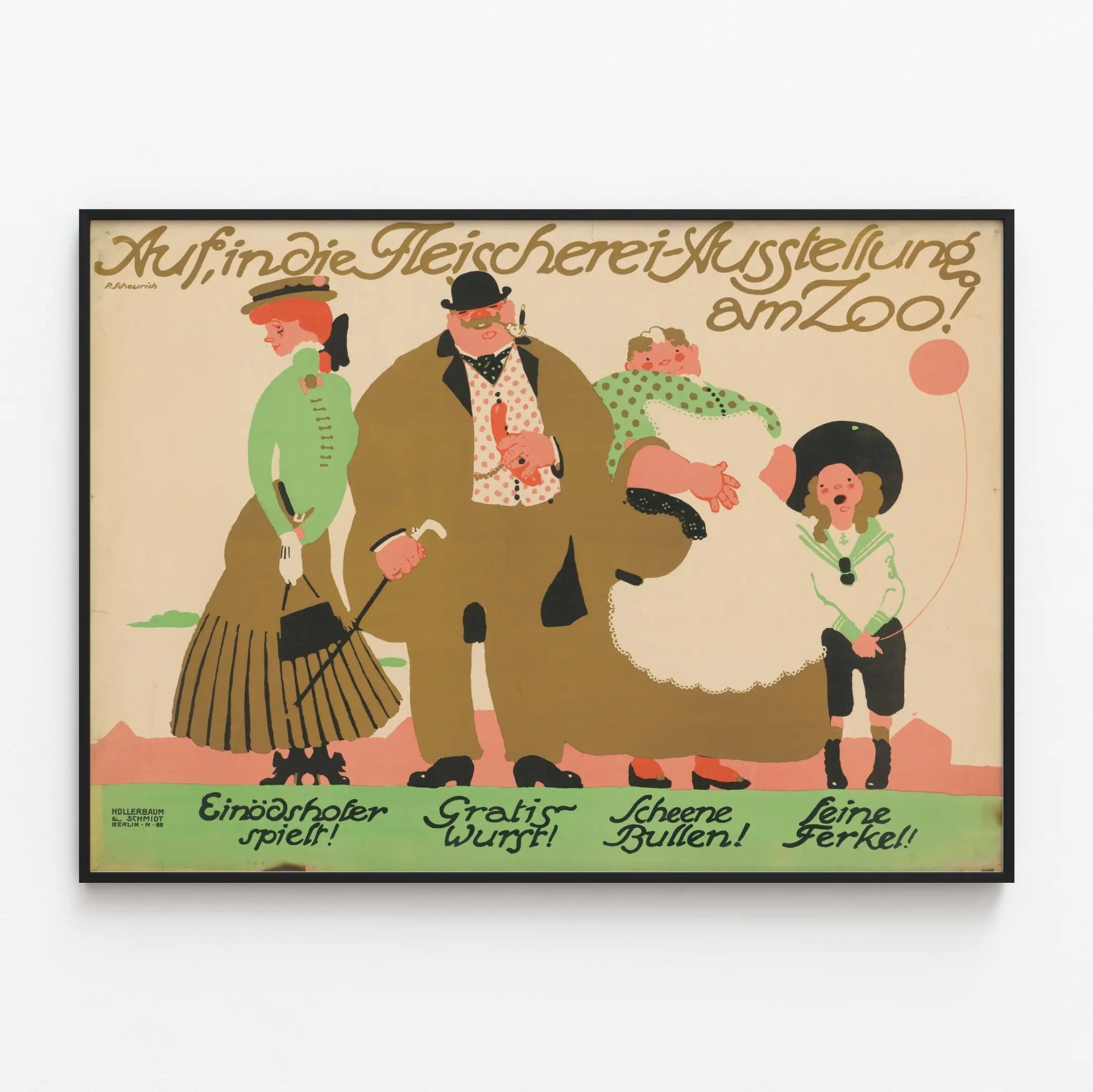 Découvrez cette affiche vintage illustrant une invitation à une exposition de boucherie au zoo, un exemple unique de décoration murale alliant humour et style rétro. Cette illustration pleine de charme met en scène quatre personnages aux silhouettes arrondies dans des tenues élégantes de l'époque, créant une atmosphère conviviale et décalée. Le fond beige met en valeur les aplats de couleurs douces, notamment le vert, le brun, le noir et le rose, tandis que les inscriptions calligraphiées en allemand apportent un aspect typographique ancien. Cette affiche au graphisme simple mais expressif est idéale pour enrichir une décoration murale d'intérieur en y ajoutant une touche d'authenticité et de nostalgie. Que ce soit dans un salon, une cuisine ou un espace de restauration, ce poster vintage est un élément décoratif qui attire le regard et invite à la curiosité. Grâce à son style illustratif et son message original, cette affiche décorative s'adresse aux amateurs d'art graphique ancien, de design rétro et de thèmes culinaires. Apportez une ambiance chaleureuse et singulière à vos murs avec ce tableau poster représentant une scène pleine de vie et de caractère. Parfait pour les passionnés de décoration murale qui recherchent un objet artistique à la fois esthétique et chargé d'histoire, ce poster vintage est une pièce maitresse à exposer pour un effet garanti. Offrez à vos murs une décoration singulière grâce à cette affiche illustrée, incarnant une époque révolue et un art du trait hors du commun.