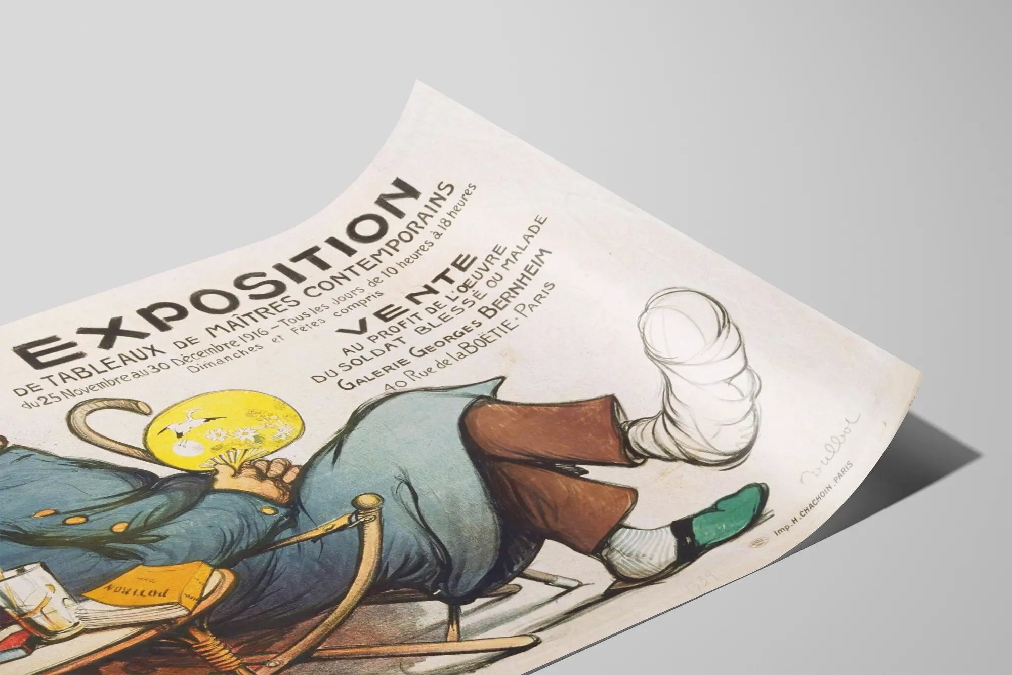 Découvrez cette affiche vintage exceptionnelle qui annonce une exposition de tableaux de maîtres contemporains, organisée à Paris en 1916. Ce poster publicitaire se démarque par son illustration détaillée représentant un soldat blessé, assis dans un fauteuil, symbole de l'œuvre caritative en faveur des soldats blessés ou malades. L'événement se déroulait à la Galerie Georges Bernheim, située au 40 rue de la Boétie, un lieu emblématique pour les amateurs d'art et de décoration murale du début du XXe siècle.