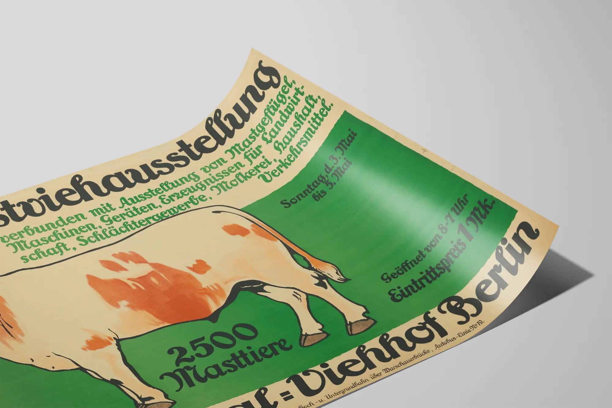 Cette affiche vintage publicitaire met en avant la 40e exposition d'élevage (40. Mastviehausstellung) organisée au Central-Viehhof de Berlin. Elle fait la promotion d'un événement agricole important, dédié à la présentation de 2500 animaux d’élevage, illustrée par le dessin d’un taureau aux couleurs chaudes sur un fond vert et beige. Ce poster annonce également la présence d'expositions complémentaires liées à l’élevage de volailles, aux machines agricoles, équipements divers et produits issus de l’agriculture, ainsi qu’au secteur de la transformation des aliments, du commerce de la viande, de la laiterie, de l’entretien ménager et des moyens de transport. Le texte révélant la date de l’événement précise une tenue du dimanche 3 mai au mardi 5 mai, avec des horaires allant de 8h à 19h. Cette affiche est caractéristique de la publicité agricole moderne et populaire du début du XXe siècle à Berlin, conçue pour attirer un public large intéressé par la production agricole et les innovations techniques. En déco murale, elle se révèle parfaite pour les amateurs d’affiches anciennes et thématiques agricoles, apportant une touche rétro et authentique à l’espace. Le style graphique sobre et la typographie soigneusement travaillée en font un élément décoratif qui peut enrichir un intérieur ou un commerce avec un aspect historique et culturel lié à l’agriculture et l’élevage. Ce poster est idéal pour une décoration murale originale dans un salon, une salle d’exposition rurale, un bureau agricole ou un lieu d’accueil touristique. Sa composition claire avec un fort contraste entre les parties illustrées et textuelles facilite la lecture et capte l’attention. Il représente une pièce décorative forte pour toute collection dédiée aux affiches anciennes, posters thématiques sur l’agriculture, ou à la promotion d’événements et expositions rurales. Ce tableau mural allie ainsi esthétique et histoire, tout en proposant une forte valeur identitaire liée au patrimoine agricole de Berlin.