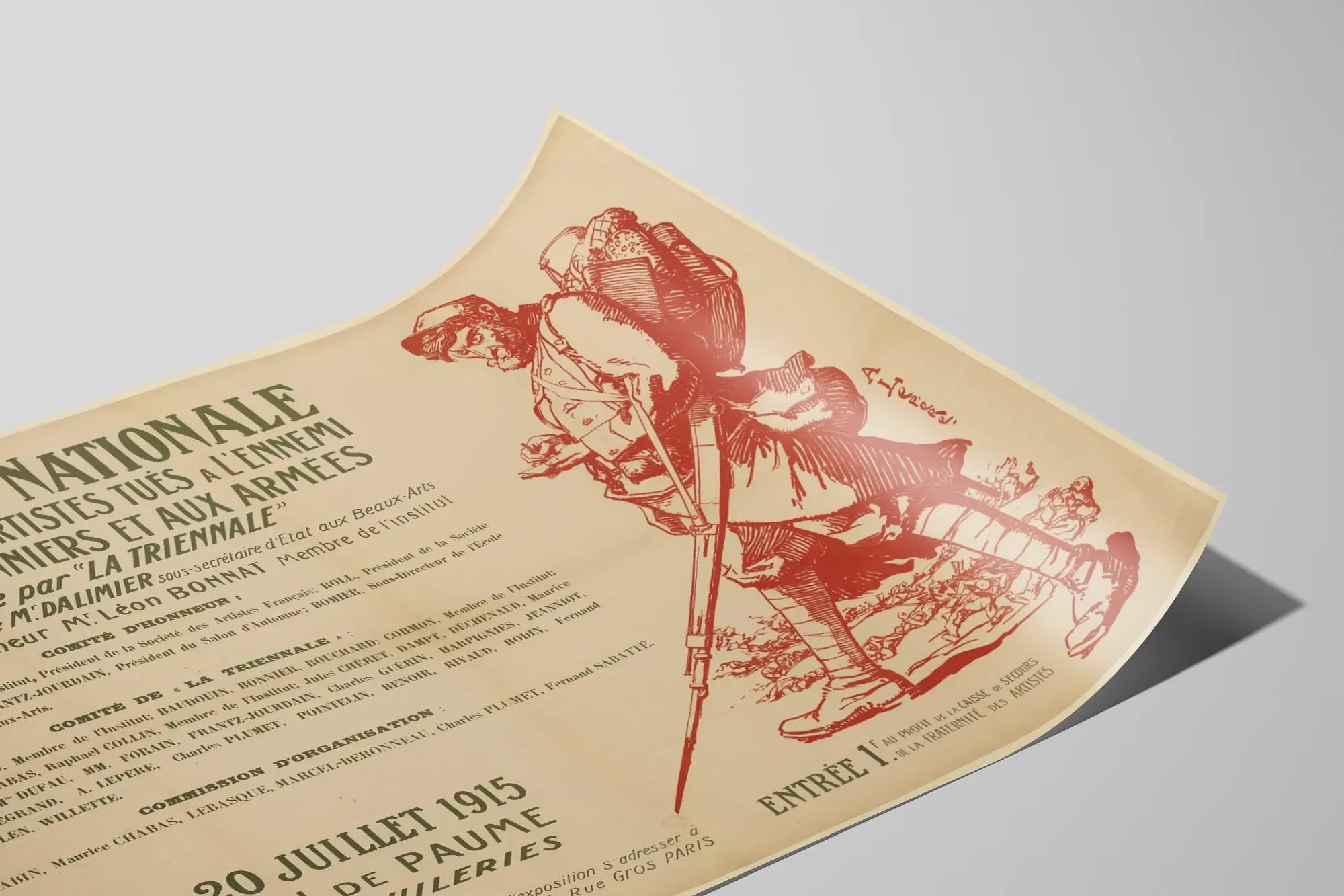 Cette affiche ancienne promeut l'Exposition Nationale des œuvres d'artistes tués à l'ennemi, blessés, prisonniers ou engagés aux armées, prévue du 20 mai au 20 juillet 1915. Elle est un exemple marquant de décoration murale historique, mêlant typographie forte et illustration expressive. Cette pièce de collection représente un soldat en uniforme avec un sac à dos, illustré dans un style graphique détaillé et vintage, qui peut être un bel élément décoratif pour les passionnés d'histoire, d'art militaire ou de design rétro. L'affiche a été organisée sous le patronage officiel de personnalités du monde des beaux-arts et regroupe les noms de plusieurs artistes et membres influents de la société artistique française de l'époque. Elle est également un témoignage visuel unique de la manière dont l'art a été mobilisé en soutien à la cause des artistes engagés dans la guerre. Offrant un mélange d'informations textuelles et graphiques, cette décoration murale peut s'intégrer dans un intérieur classique ou vintage, apportant une touche émotionnelle et un sujet de réflexion autour du sacrifice artistique et militaire. Idéale en poster ou en tableau encadré, elle s'adresse à ceux qui apprécient les pièces historiques rares et porteuses d'un message puissant. Cette affiche, par sa dimension commémorative et stylistique, se distingue comme un élément fort pour enrichir toute collection d'affiches anciennes ou murales à thématique patriotique et artistique.