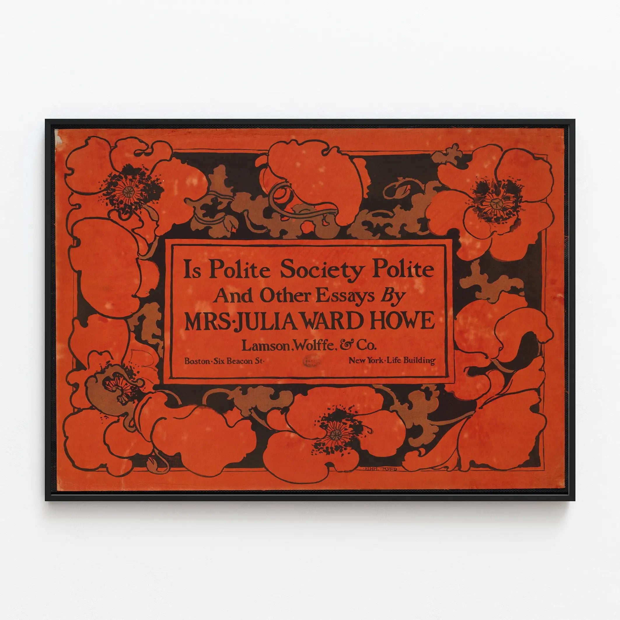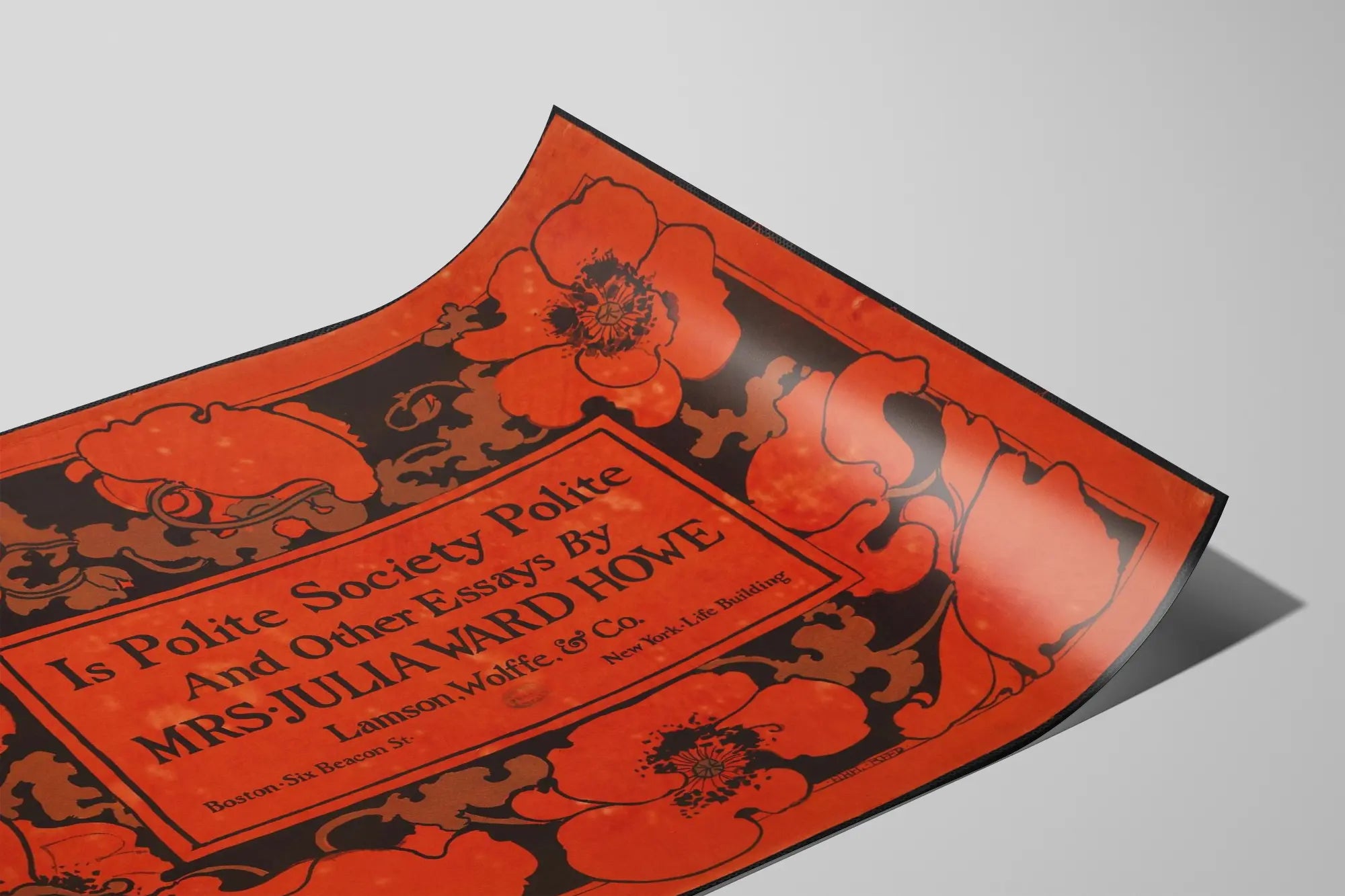 Découvrez cette affiche vintage unique affichant le titre "Is Polite Society Polite And Other Essays By Mrs. Julia Ward Howe". Avec son fond rouge vif et ses motifs floraux orange et marron, cette décoration murale apporte une touche rétro et élégante à tout espace intérieur. Les fleurs stylisées entourent le texte central, attirant naturellement le regard vers l'inscription au centre, dans une typographie ancienne qui renforce le charme classique de cette pièce. Cette composition design se prête parfaitement à une ambiance chaleureuse et artistique, idéale pour les amateurs d'affiches au style rétro et d'éléments de décoration murale au caractère affirmé. L'affiche est un excellent choix pour enrichir un salon, un bureau ou une bibliothèque, apportant une ambiance littéraire et historique grâce à la référence à Julia Ward Howe, écrivaine et militante. Ce poster rétro combine harmonieusement couleurs vives et design floral, contribuant à une décoration murale originale qui capte l'attention tout en apportant une touche d'élégance ancienne. Ce type d'affiche est parfait pour les passionnés de vintage comme pour ceux qui souhaitent créer un décor unique avec une pièce chargée d'histoire visuelle et littéraire.
