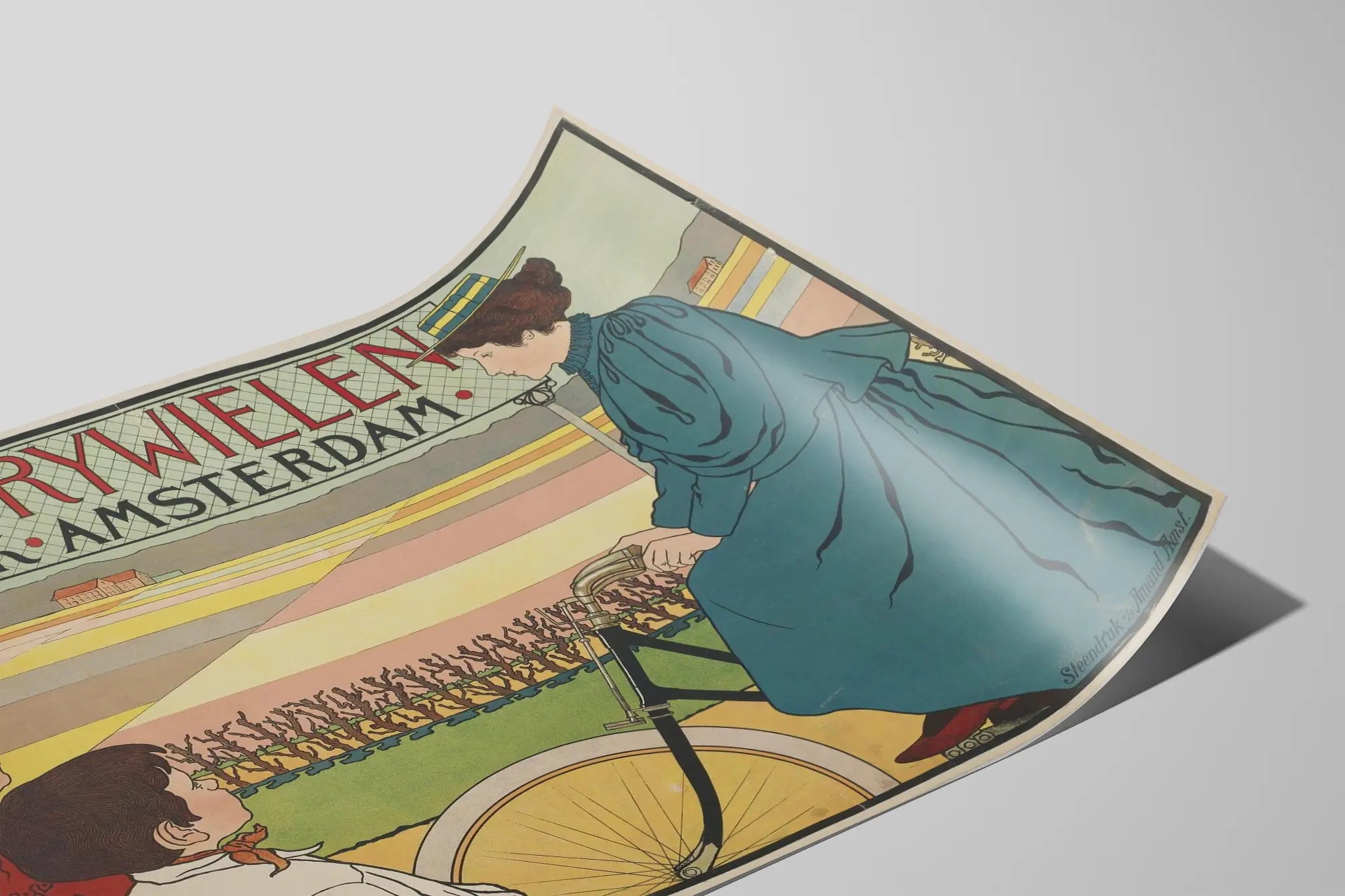 Cette affiche vintage intitulée « Hinde Rywielen Fabriek Amsterdam » est une pièce de décoration murale remarquable qui apportera une touche rétro et artistique à votre intérieur. Représentant une scène d'époque, cette illustration met en avant une dame élégamment vêtue, assise sur un vélo ancien, observée par deux enfants. Le style graphique, aux lignes tracées avec précision et aux couleurs douces, illustre parfaitement l'art publicitaire d'autrefois et révèle un charme authentique et nostalgique. Le texte en haut de l'affiche, en caractères majuscules rouges et noirs, indique clairement l'origine et le thème de cette publicité : une usine de fabrication de vélos basée à Amsterdam. Cette affiche est idéale pour les amateurs de décoration murale vintage, d'affiches publicitaires anciennes ou pour toute pièce cherchant à ajouter une ambiance rétro avec une touche européenne. Son format horizontal et ses nuances pastel, associées à des éléments graphiques clairs, offrent un équilibre visuel harmonieux, parfait pour sublimer un salon, un bureau ou une boutique spécialisée. Que vous soyez passionné de vélos, d'art graphique ou simplement à la recherche d'un poster original, ce tableau imprimé évoque une époque où le vélo était déjà un symbole de mobilité et d'élégance. Ce poster vintage est un hommage à l'industrie et au design d'Amsterdam, incarnant une histoire locale riche et une esthétique intemporelle adaptée à une décoration murale authentique et raffinée.