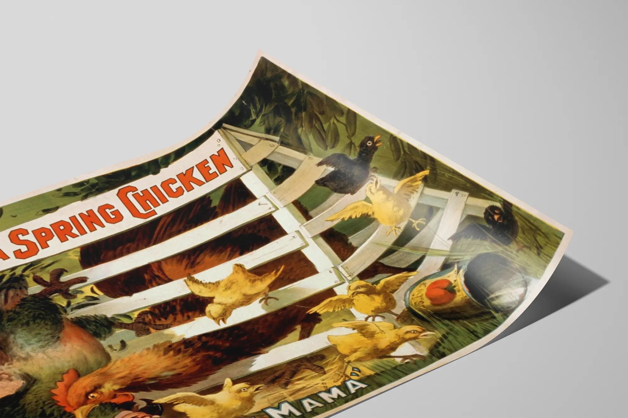Découvrez cette affiche vintage humoristique intitulée "A Spring Chicken" de Selden, une pièce originale et charmante pour votre décoration murale. Ce poster met en scène une poule en pleine farce, prise au piège derrière une barrière en bois blanche, tandis que ses poussins s'agitent tout autour d'elle, accentuant l'effet comique et dynamique de la scène. L'illustration est riche en détails, avec un jeu subtil sur les expressions des oiseaux et un cadre naturel verdoyant en arrière-plan. Le texte en haut de l'affiche, "Selden's Funny Farce A Spring Chicken", ajoute une touche rétro et authentique, tandis qu’en bas, l’expression "Oh! Mama" renforce le ton humoristique de cette œuvre. Ce poster s'intègrera parfaitement dans un intérieur de style vintage, rustique ou campagnard, apportant une note joyeuse et conviviale à vos murs. Idéal pour les amateurs de décoration murale originale et décalée, ce tableau affiché en grand format captera l’attention par son graphisme vivant et ses couleurs chaudes. Que ce soit dans une cuisine, une salle à manger ou une pièce à vivre, cette affiche animalière réveille l’atmosphère avec humour et authenticité. Ajoutez une touche de caractère à votre espace avec cette décoration murale pleine de charme et de gaieté, capable de s’harmoniser avec différents styles d’intérieur, tout en créant un point focal attractif. Une excellente idée pour donner vie à vos murs grâce à une illustration vintage unique et expressive.