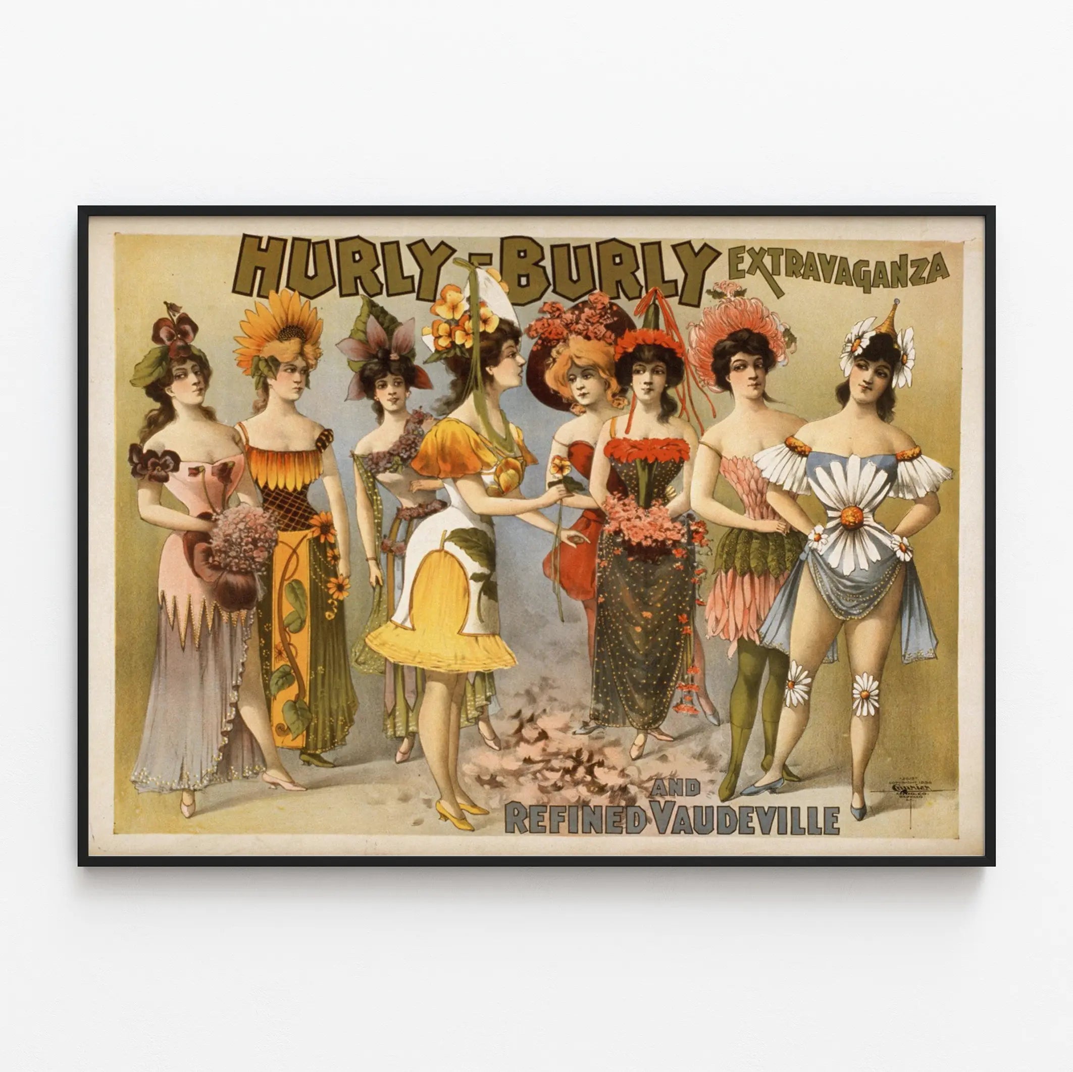 Découvrez cette magnifique affiche vintage intitulée « Hurly Burly Extravaganza and Refined Vaudeville », une véritable pièce de décoration murale qui captera tous les regards. Ce poster présente un groupe de huit femmes élégamment costumées, chacune arborant une tenue colorée et originale inspirée par les fleurs, soulignant un style théâtral typique du vaudeville. Les costumes variés, tout en finesse et en détails, apportent une touche artistique et rétro qui embellira efficacement tout intérieur. Cette affiche murale au charme d'antan est parfaite pour habiller un mur avec sophistication, en apportant une ambiance de spectacle et de fantaisie chic. L'harmonie des couleurs, allant des tons chauds orangés et rouges aux nuances délicates de bleu et vert, ajoute un effet visuel équilibré et plaisant. Ce tableau décoratif renforce l'atmosphère vintage tout en mettant en avant l'esthétique théâtrale et festive d'une extravaganza vaudeville. Idéal pour être encadré et mis en valeur dans un salon, un bureau ou un espace créatif, cet élément de décoration murale vintage invite au voyage dans le temps et à la célébration des arts de la scène. Donnez à votre intérieur une personnalité originale et raffinée avec ce poster unique, synthèse parfaite entre spectacle, élégance et tradition artistique.