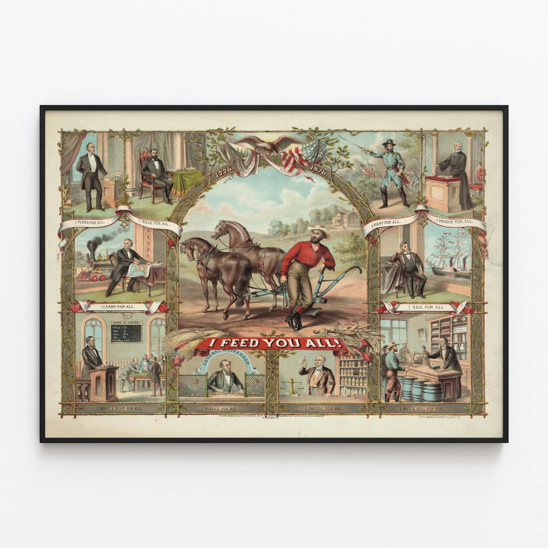Cette affiche vintage intitulée "I Feed You All" présente une composition riche et détaillée symbolisant différents métiers et rôles au sein de la société américaine, mettant en avant la diversité des activités nécessaires à la vie collective. Au centre, un fermier avec deux chevaux attelés à une charrue illustre l'importance de l'agriculture dans l’alimentation de la population. Cette scène centrale est encadrée par plusieurs vignettes mettant en valeur d'autres professions et actions. À gauche, on distingue un homme plaidant, un dirigeant, un technicien devant une carte associée au chemin de fer, et une scène liée au commerce avec une ardoise indiquant des prix agricoles. À droite, différentes figures représentent un soldat en uniforme confédéré, un prédicateur, un marin contemplant un navire et un commerçant vendant des marchandises. En bas, diverses fonctions comme le courtage général, la médecine de pharmacie et la vente sont évoquées, soulignant la complexité et l'interdépendance des métiers qui soutiennent la société. L'affiche porte au sommet deux drapeaux américains d'époque ainsi qu'un aigle, symboles patriotiques américains avec la mention « E Pluribus Unum ». Cette composition reflète une époque historique des États-Unis, encourageant la reconnaissance de tous ceux qui "nourrissent" et contribuent à la nation. Idéale comme décoration murale, cette affiche apporte une touche d'histoire et d'authenticité à tout intérieur. Que ce soit dans un salon, un bureau ou une bibliothèque, elle évoque la richesse du travail collectif et les multiples contributions au développement d’une société. Son style vintage et ses détails soignés offrent un charme ancien qui séduira les amateurs d'histoire américaine et de décoration murale originale. En ajoutant ce poster dans votre collection, vous valorisez un pan de l’histoire des États-Unis à travers une image conceptuelle à la fois informative et esthétique. Cette décoration murale est parfaite pour créer une atmosphère à la fois culturelle et inspirante, mettant en lumière les divers métiers indispensables à la communauté. Un choix d’affiche unique qui invite à la réflexion sur la solidarité et le travail quotidien. Conçue pour tous ceux qui apprécient les œuvres graphiques historiques, cette affiche se distingue par son iconographie riche et la mise en scène narrative de ses personnages. Une superbe pièce pour personnaliser un espace avec une touche d’authenticité et un clin d’œil à l’histoire sociale américaine.