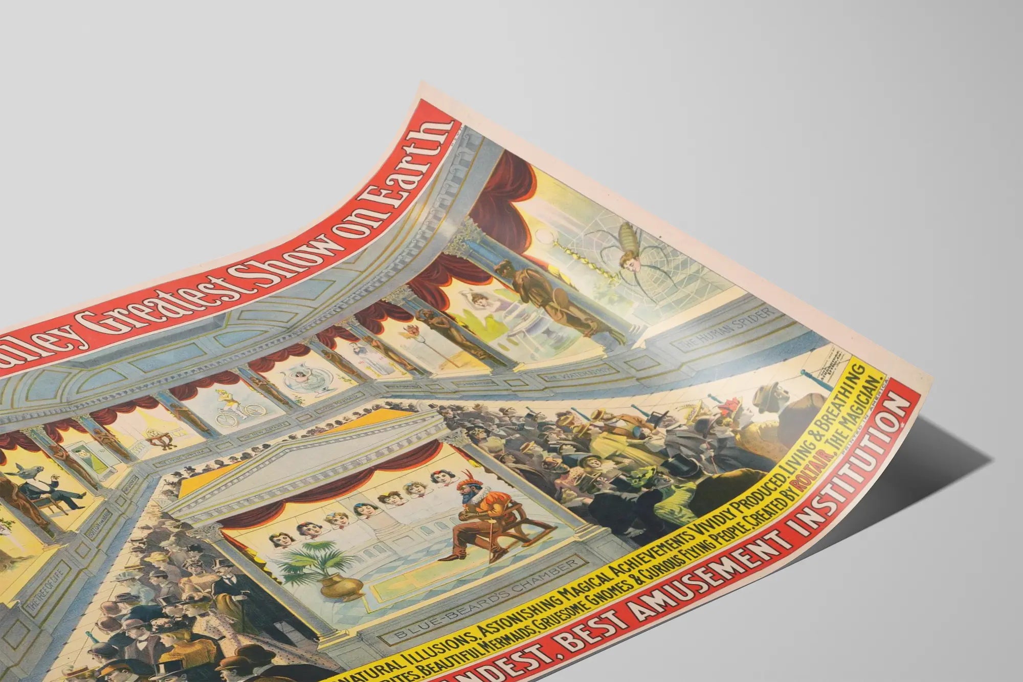 L'image met en scène une salle de spectacle décorée de moulures classiques et de colonnes ornées, entourée d'un public captivé. On y retrouve plusieurs vitrines où sont exposées différentes illusions et figures fantastiques, telles que la "Pharaoh's Daughter", "The Tree of Life", "The Living Sphinx", "The New Astarte", "Living Mermaid", "The Water Nymph" et "The Human Spider". Ces éléments sont parfaits pour sublimer un espace avec une touche d’émerveillement et un souci du détail raffiné.