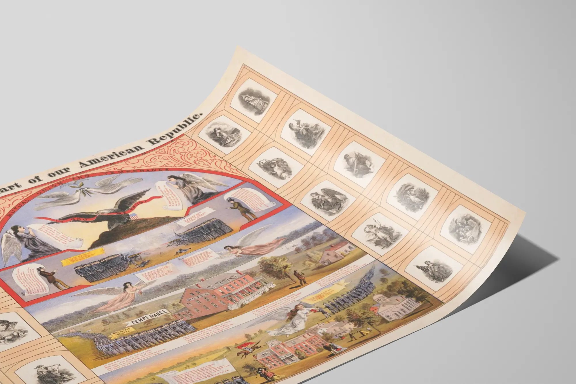 Cette affiche vintage titrée « Illustrated Chart of our American Republic » est une décoration murale riche en illustrations et symboles historiques. Elle se présente comme un poster éducatif et artistique, parfait pour les passionnés d'histoire américaine et les amateurs de décoration murale au style rétro. Le tableau central est encadré par des gravures en noir et blanc représentant des personnages et scènes diverses, encadrées de voûtes architecturales qui donnent une structure visuelle équilibrée et harmonieuse à l'ensemble.