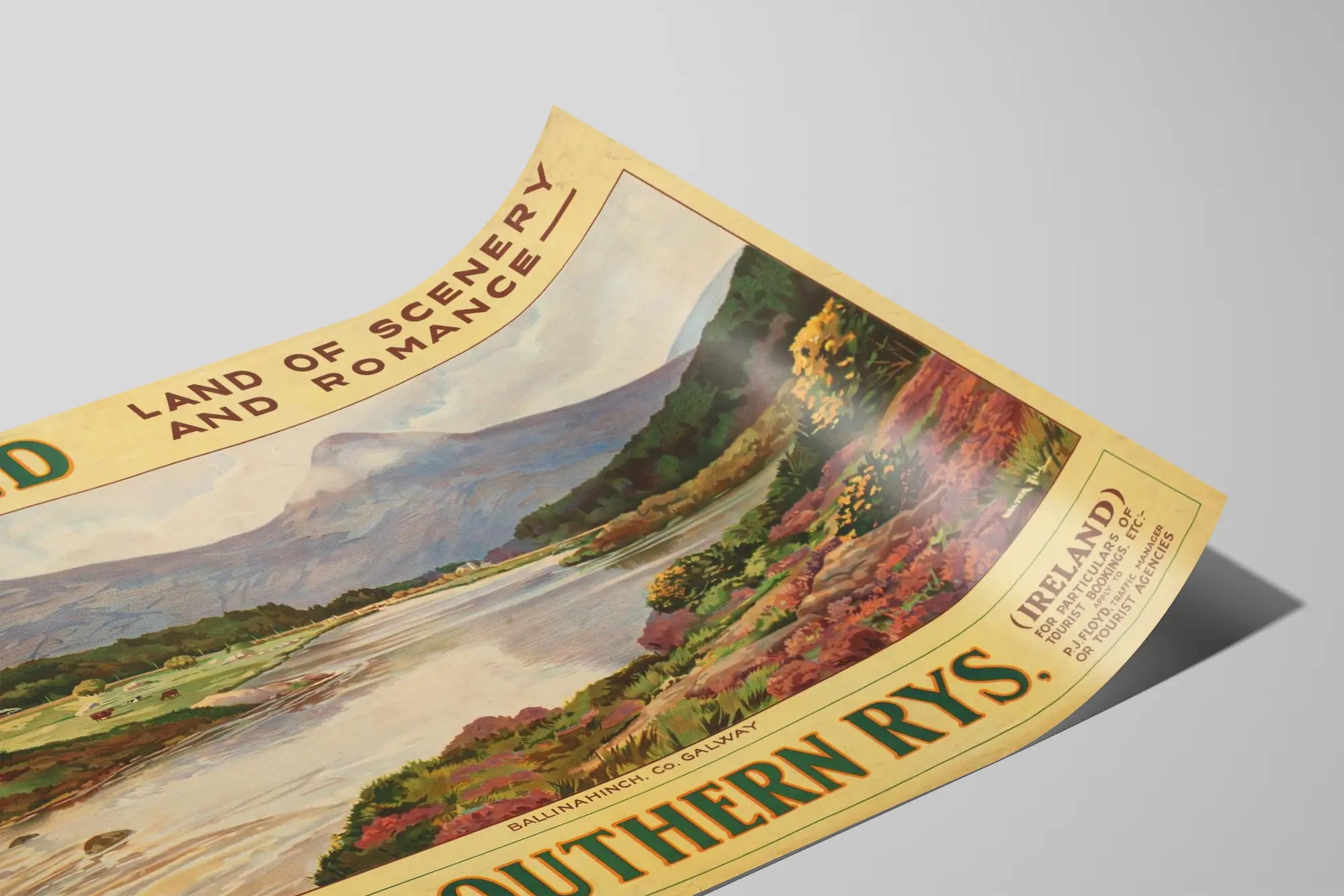 Cette affiche vintage met en scène un magnifique paysage naturel d'Irlande, plus précisément à Ballinahinch dans le comté de Galway. Elle illustre un panorama empreint de tranquillité et de romantisme, mettant en avant les collines verdoyantes, une rivière aux reflets doux, et une nature luxuriante ponctuée de buissons fleuris et de pierre. L’affiche porte fièrement les inscriptions "IRELAND", "Land of Scenery and Romance" et "Great Southern Rys", évoquant une invitation au voyage au cœur des paysages irlandais. Cette décoration murale au style rétro est idéale pour les amateurs d'affiches vintage et de design authentique. Elle apporte une touche d'élégance et de charme naturel à tout intérieur, qu’il soit contemporain ou classique. Le choix des couleurs, mêlant des nuances de verts, de bruns, de violets et d’ocres chauds, confère à ce poster une atmosphère douce et chaleureuse qui se marie parfaitement avec des murs neutres ou des intérieurs boisés. Ce poster s'adapte parfaitement à toute pièce à vivre, bureau ou espace dédié à la détente, invitant à la rêverie et à l'évasion. Grâce à son format focalisé sur la beauté du paysage naturel, il souligne l’importance des éléments de la nature dans la décoration murale, renforçant un style hygge ou vintage. Il peut être encadré avec un cadre simple en bois clair ou foncé pour accentuer son côté authentique et naturel. L’affiche constitue un hommage visuel à l’Irlande et à ses attraits touristiques, notamment à sa campagne idyllique qui inspire souvent le romantisme et la poésie. Son style graphique reflète une époque où le voyage était un art, et la promotion touristique une célébration des paysages locaux. Pour ceux qui souhaitent intégrer un élément de cette culture dans leur décoration, ce tableau mural est un choix parfait. En somme, ce poster "Ireland Land of Scenery and Romance" est une superbe pièce de décoration murale vintage qui embellira tout intérieur grâce à sa représentation apaisante et poétique de la nature irlandaise. Il séduira autant les passionnés de nature que les amateurs d'art graphique ancien, offrant un souffle d'air pur et de beauté simple dans n’importe quel espace de vie.