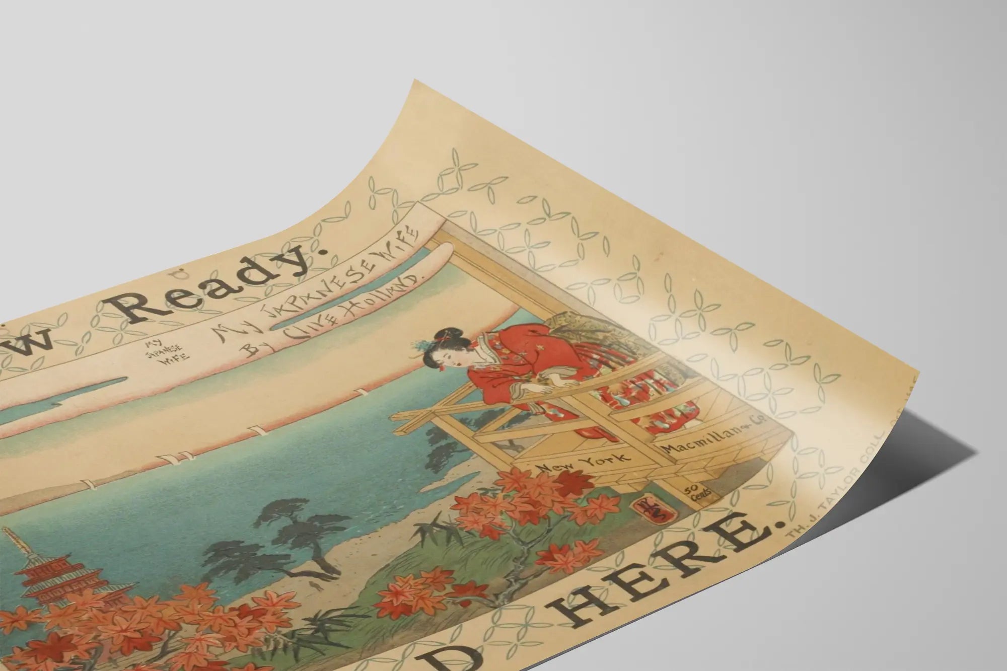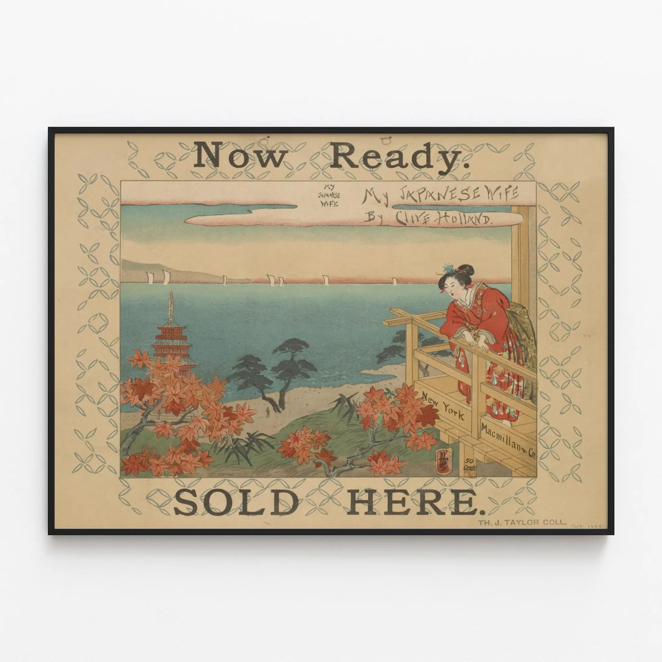 Découvrez cette affiche vintage intitulée "My Japanese Wife", une illustration signée Clive Holland qui capture l'élégance et la sérénité d'une scène japonaise traditionnelle. Cette décoration murale, au style inspiré de l'estampe japonaise, présente une femme vêtue d'un kimono rouge richement décoré, se tenant sur un balcon en bois surplombant un paysage marin paisible. En arrière-plan, on aperçoit un panorama mêlant mer et nature avec des arbres, une pagode typique et des voiliers blancs sur l'eau calme, évoquant une ambiance à la fois exotique et nostalgique. La palette de couleurs utilise des tons doux et naturels, avec des nuances de bleu, vert, orange et rouge qui participent à un rendu harmonieux et apaisant. Ce poster ancien est encadré par une bordure décorative composée d'un motif répétitif géométrique, qui renforce son charme rétro tout en mettant en valeur l'œuvre centrale. Les inscriptions en anglais "Now Ready", "Sold Here" et le nom de l'éditeur "New York Macmillan & Co." ajoutent une touche d'authenticité et de contexte historique à cette pièce unique de décoration murale. Parfait pour les amateurs d'art japonais et les passionnés de design vintage, ce tableau se prête idéalement à l'embellissement des espaces de vie, salons ou bureaux cherchant à insuffler une atmosphère zen et culturelle. L'affiche "My Japanese Wife" est une œuvre décorative qui invite au voyage et à la contemplation, mêlant avec subtilité tradition et esthétique ancienne. Un choix raffiné pour enrichir votre collection d'affiches ou pour offrir une touche d'exotisme et d'élégance à votre intérieur.